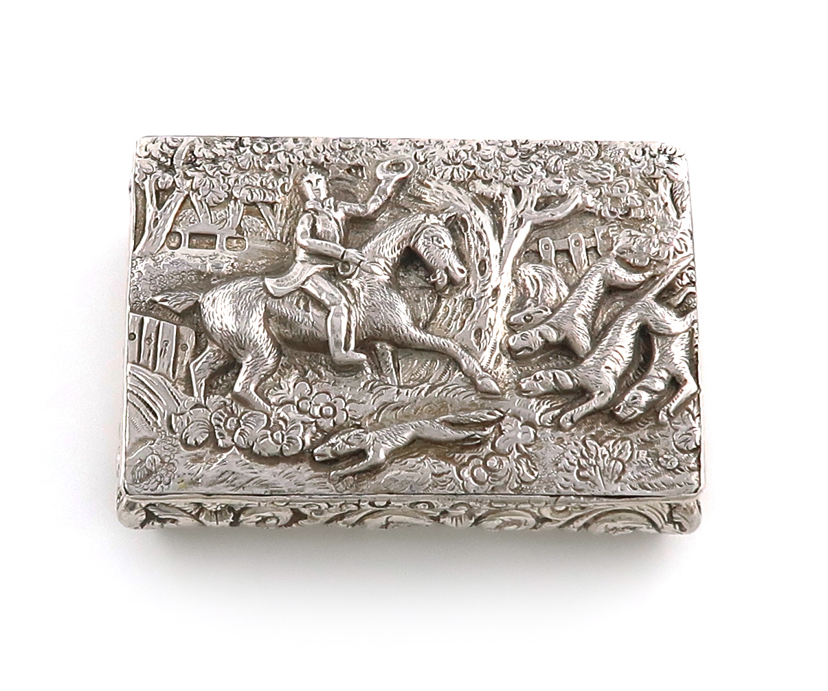 rectangular form, the hinged cover with a scene of a mounted huntsman and hounds in a landscape setting, silver-gilt interior inscribed 'Mr. James Cram by Mr. Isaac Moses, as a mark of friendship and Esteem, Portsea, Aug 31st 1838', foliate thumb-piece, foliate scroll sides, engine-turned base, length 8.2cm, approx. weight 5.8oz.