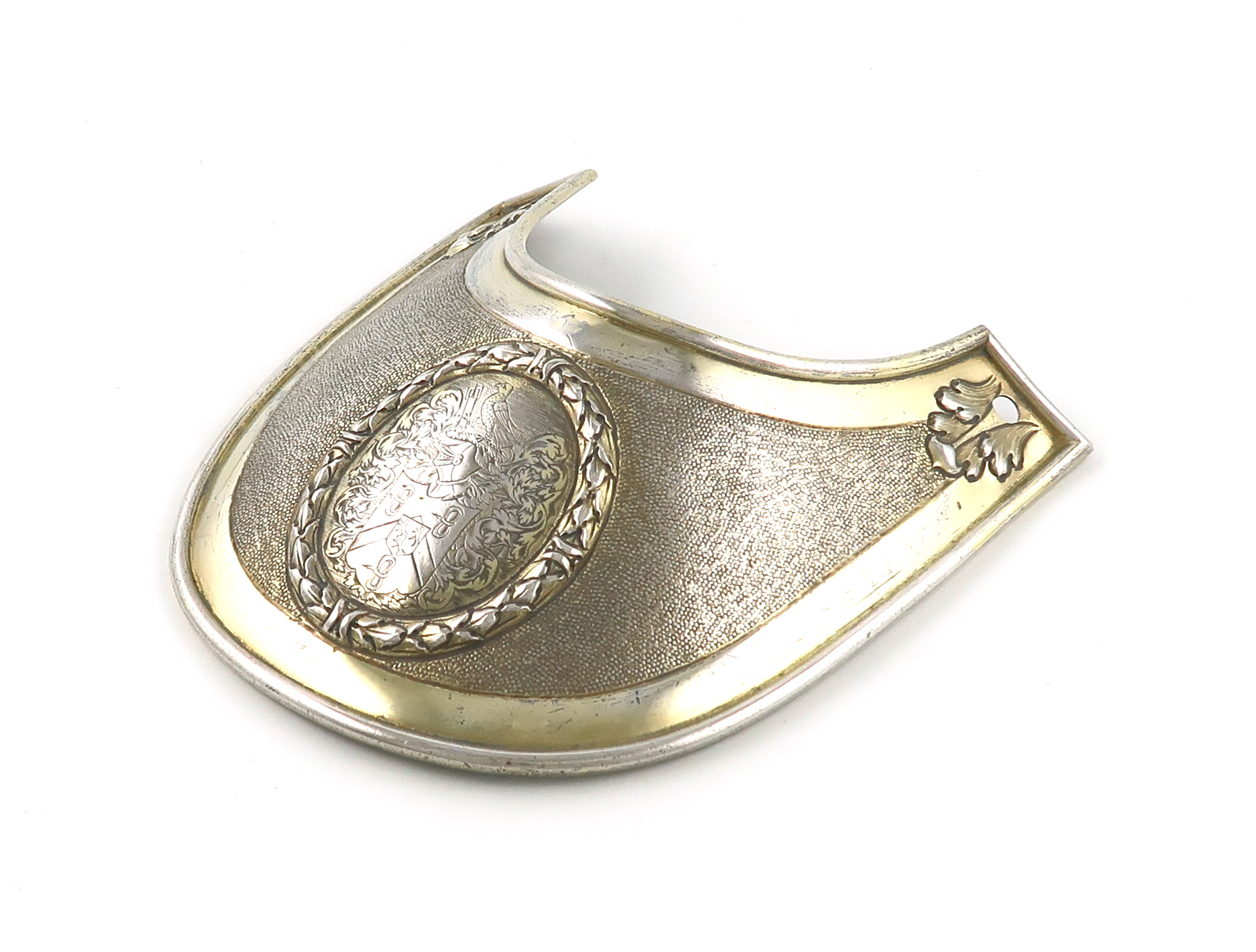 conventional form, with two holes and acanthus mounts, the centre with an armorial shield within foliate mantling and an oval wreath, with matted decoration, length 15cm, approx. weight 5.8oz.