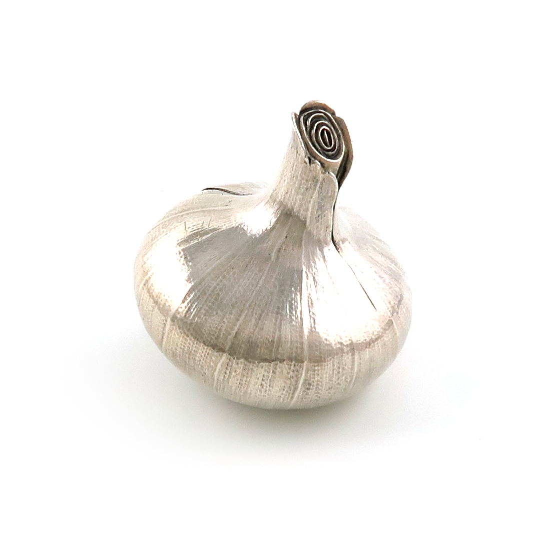 modelled as an onion, with textured onion skin, the underside with roots and a turn-action pop-up section, the hinged cover opens to reveal a glass bottle, height 5.5oz.
