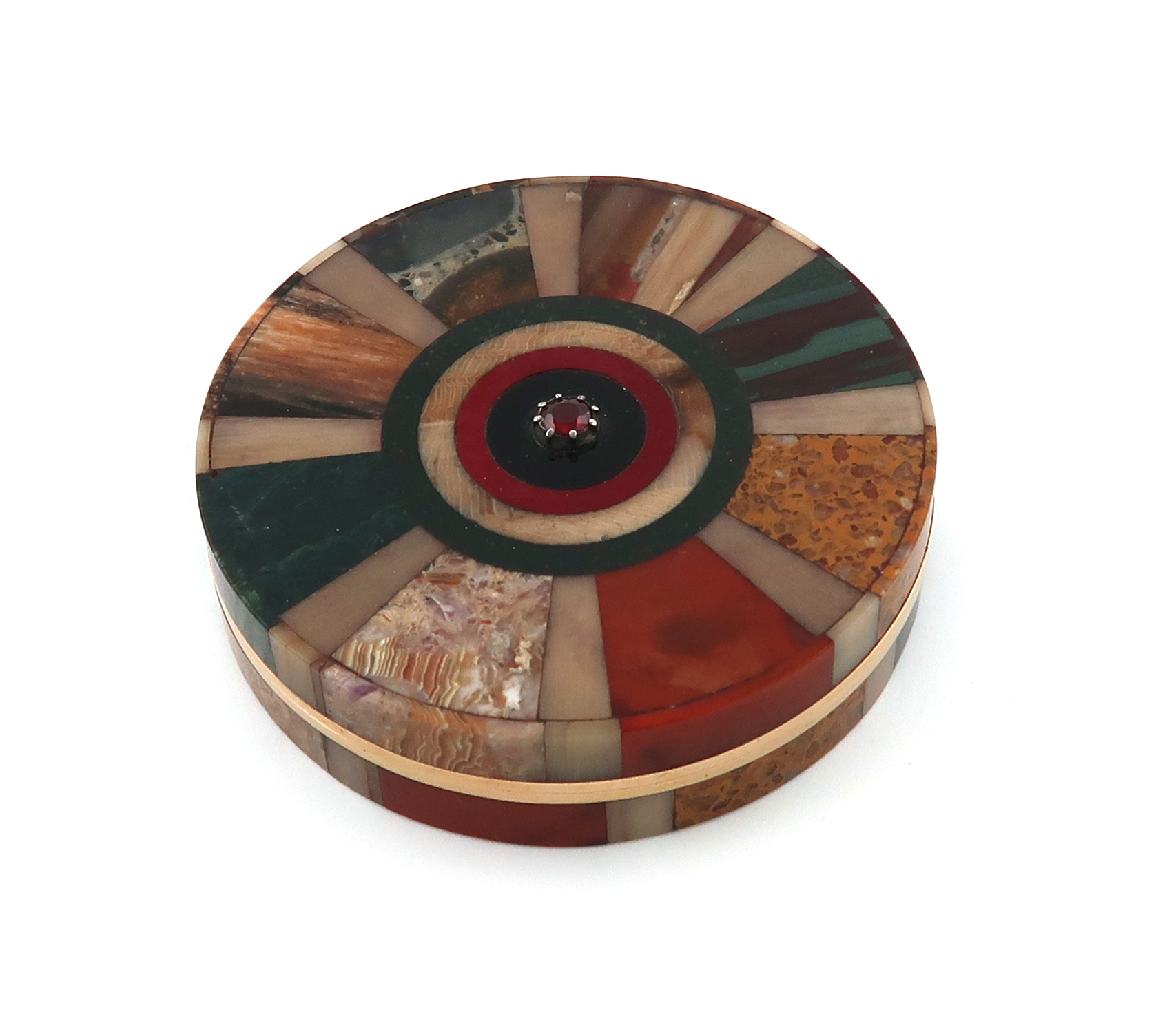circular form, plain mounts, with panels of various coloured hardstones, the centre set with a red stone, diameter 7.3cm.