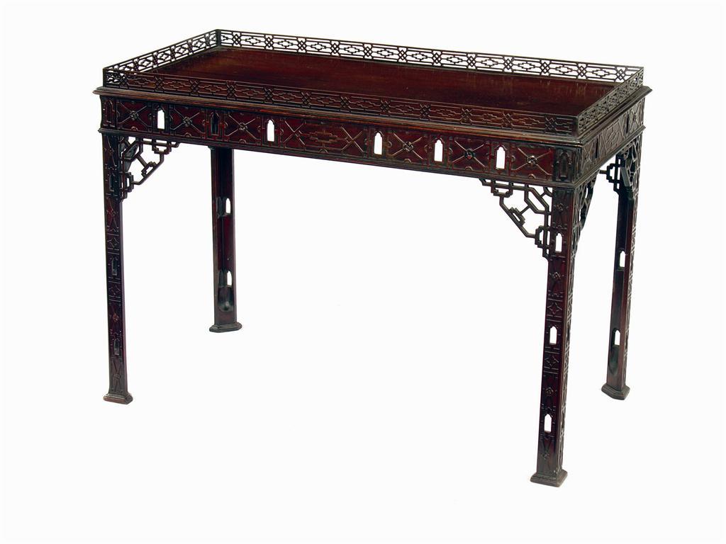 A mahogany rectangular silver table, the pierced fret galleried top above a blind fret and pierced arcaded frieze on conforming legs with pierced brackets to stepped block feet, 30.25in (76.5cm) h, 42.5in (108cm) w, 22in (56cm) d. 19th century and later..
