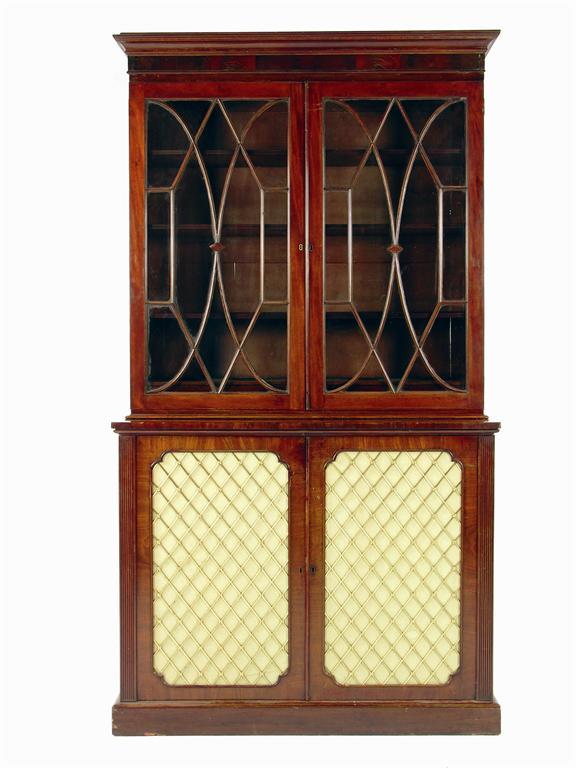 A mahogany bookcase cabinet, the detachable moulded cornice above a pair of astragal glazed doors, enclosing adjustable shelves the base with a pair of fabric backed brass grille panel doors with reeded pilasters enclosing adjustable shelves on a plinth, 92in (233.5cm) h, 53in (134.5cm) w, 20.5in (52cm) d.
