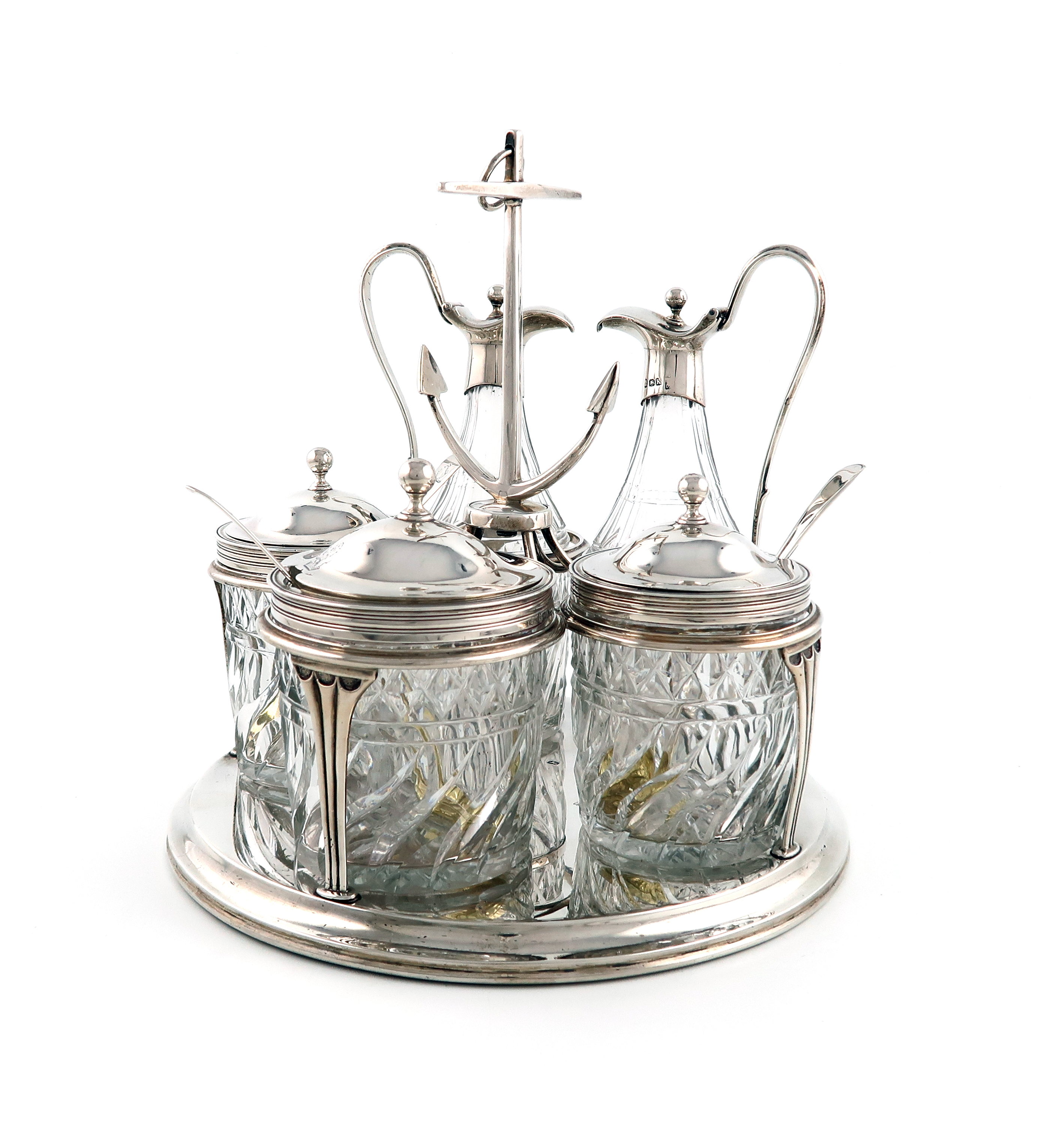 circular form, wire-work frame, the central carrying handle modelled as an anchor, with two silver-mounted oil and vinegar bottles, and three jars with pull-off covers and ball finials engraved with a crest, plus three assorted condiment spoons, height 22.5cm.