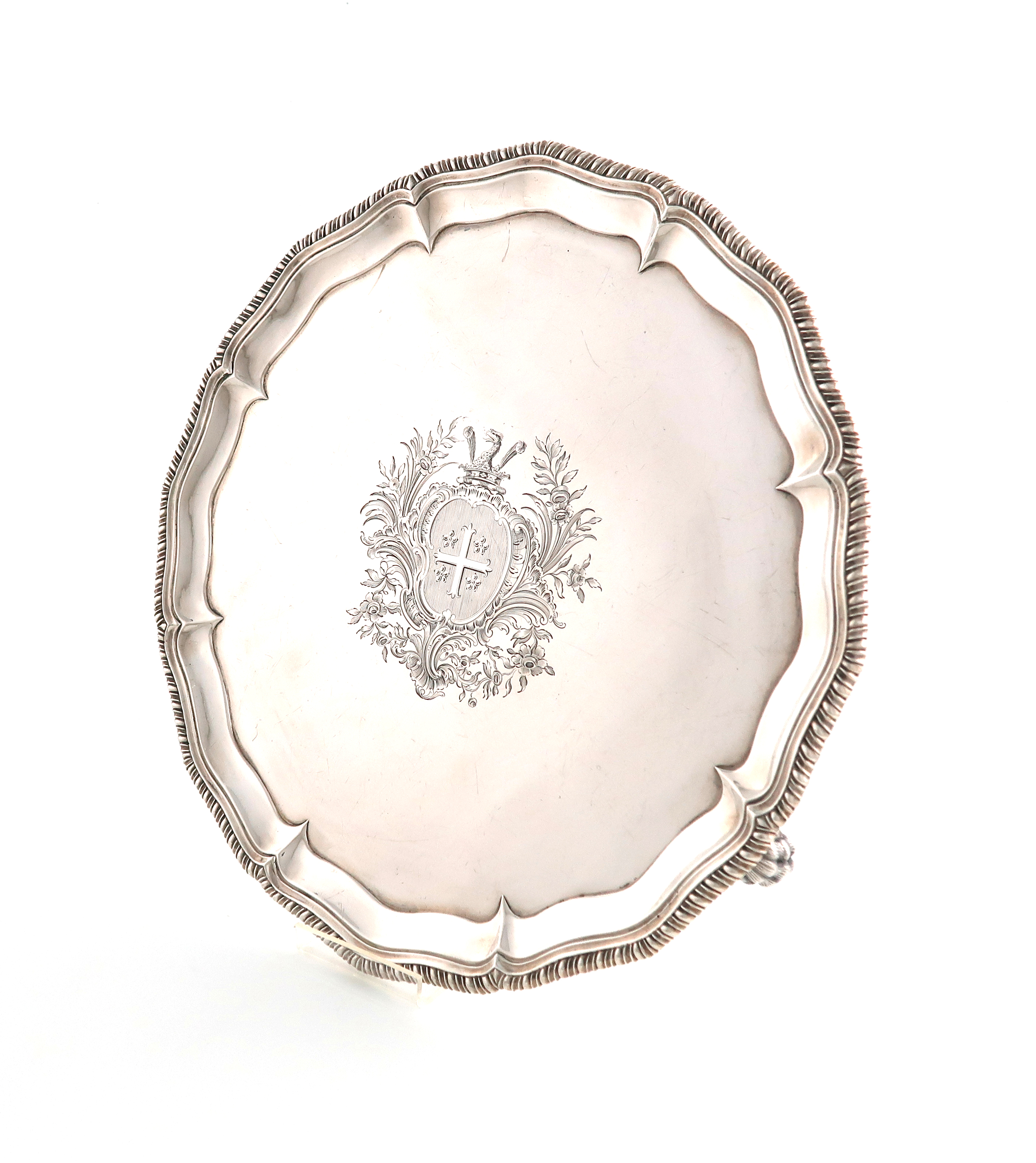 circular form, gadroon border, the centre with an armorial within foliate scroll mantling, on three claw and ball feet, the underside with a scratch weight, '40oz=7', diameter 34.2cm, approx. weight 40.1oz.