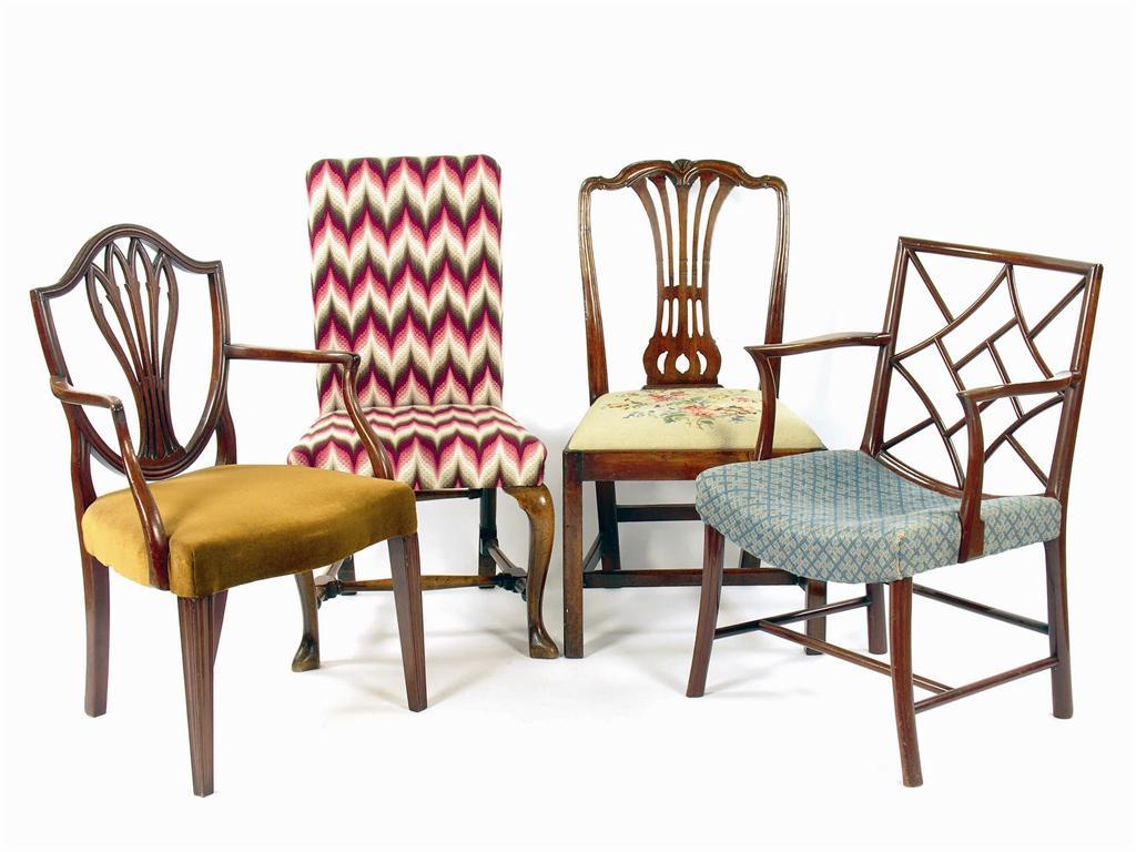 A Queen Anne style side chair, upholstered back and seat on walnut cabriole legs, a 19th century mahogany side chair and two armchairs in 18th century styles. (4)