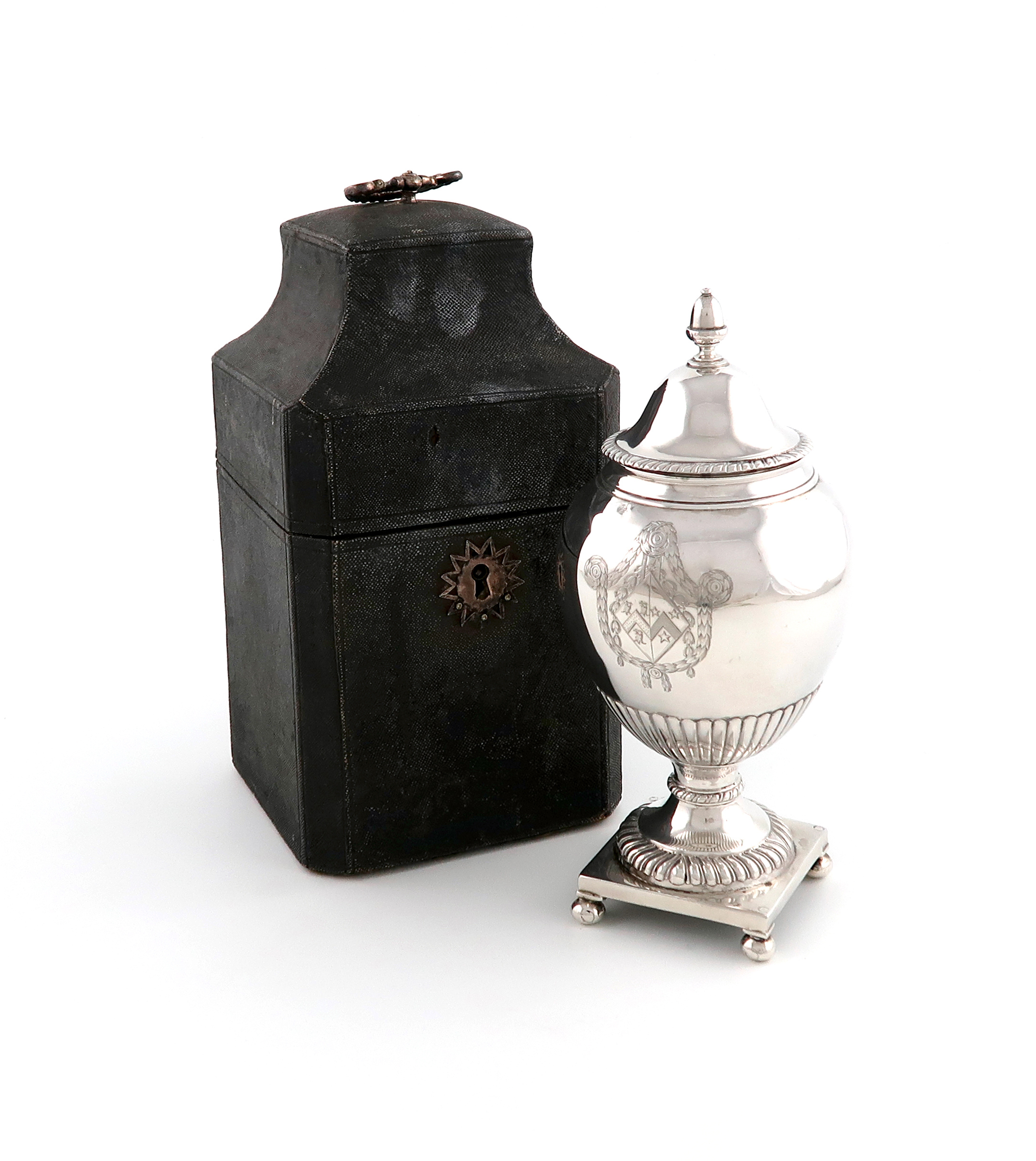 plain urn form, part-fluted decoration, gadroon borders, engraved with an armorial, the pull-off cover with an acorn finial, on a raised circular foot on a square base on four bun feet, in a fitted red velvet lined silver-mounted shagreen case, with a silver scroll handle and silver lock plate, height 18.2cm, the height of case 20cm, approx. weight 9.1oz. (2)
