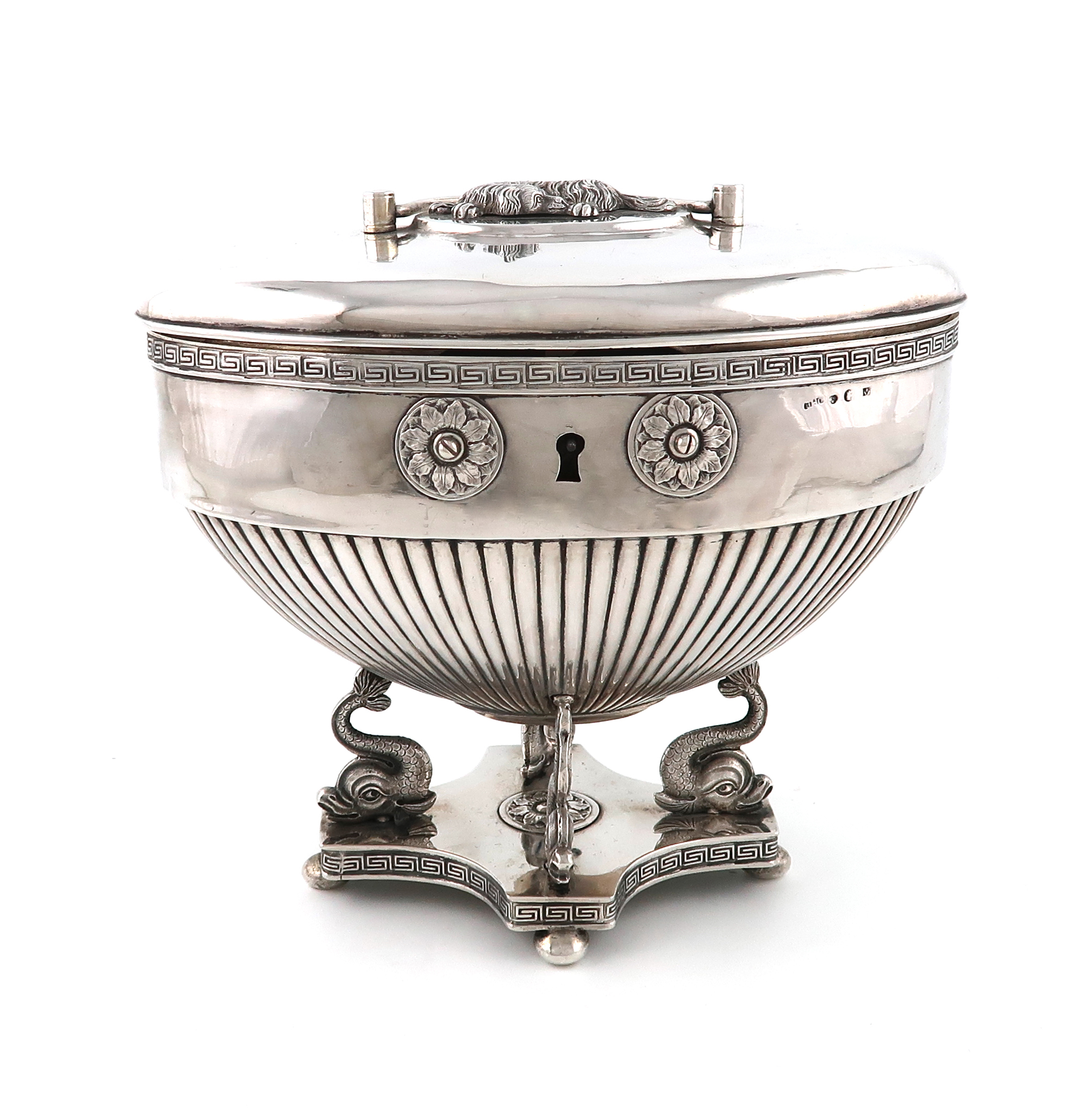 oval form, part-fluted decoration, Greek key borders, the hinged cover with a swing-handle and recumbent dog finial, on four mythical dolphin supports on a shaped rectangular base, on four bun feet, height 17cm, approx. weight 26oz.