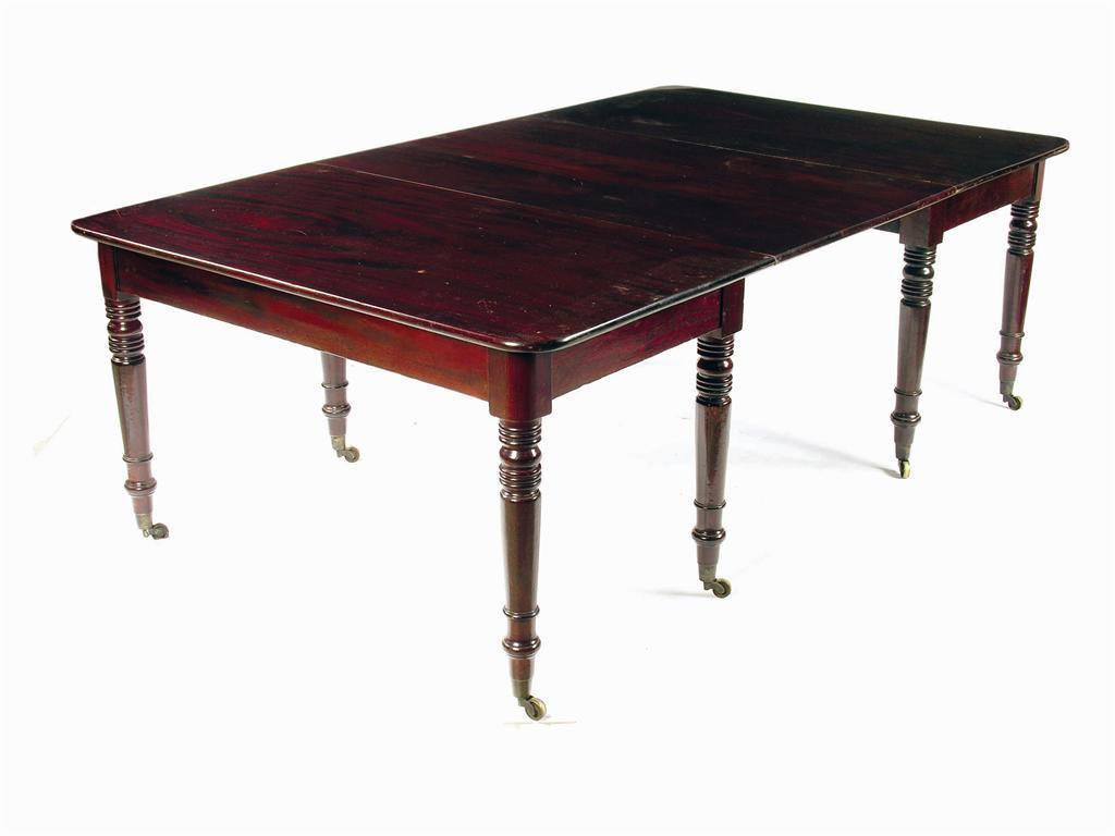 A 19th century mahogany dining table, the pair of ends on ring turned tapering legs to brass castors, with an extra leaf, 28in (71cm) h, 82.5in (209cm) d, 49.25in (125cm) w.