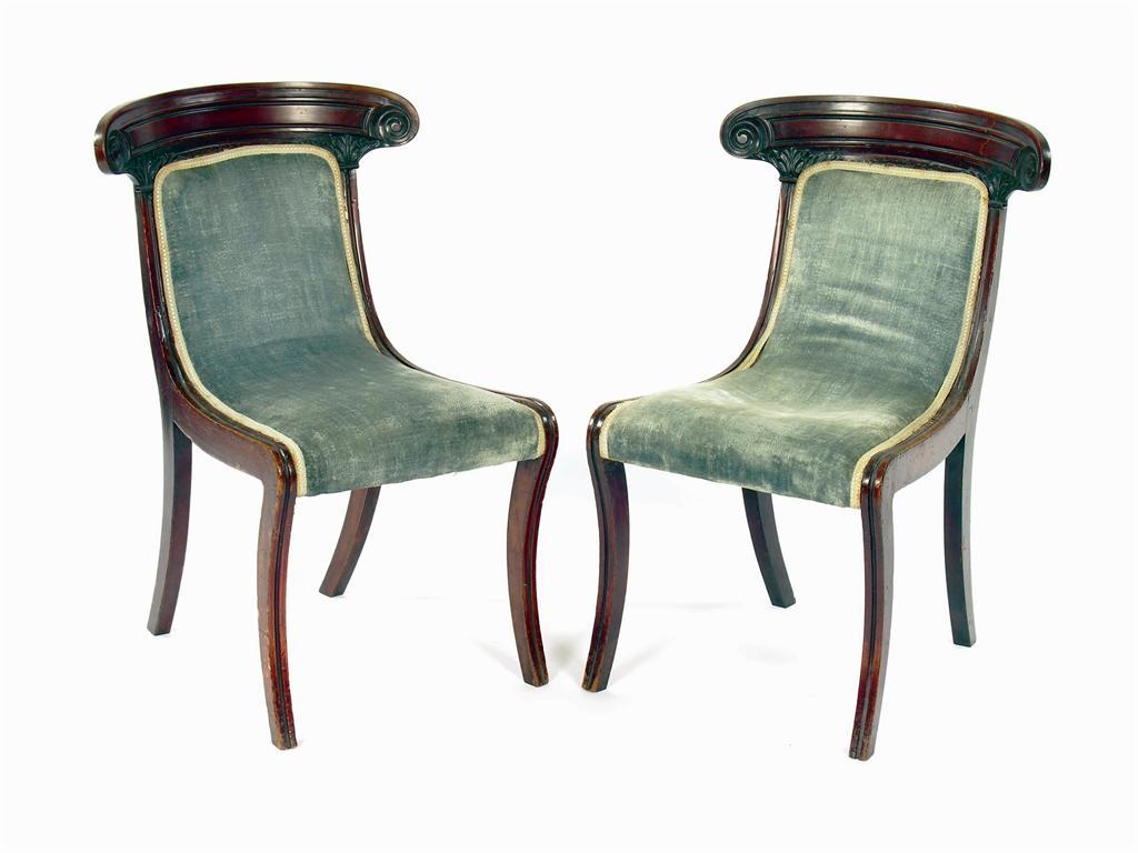 A pair of George IV mahogany side chairs, the curved top rails with scroll ends above leaf carved moulded supports to later upholstered seats and backs with sabre legs. (2)