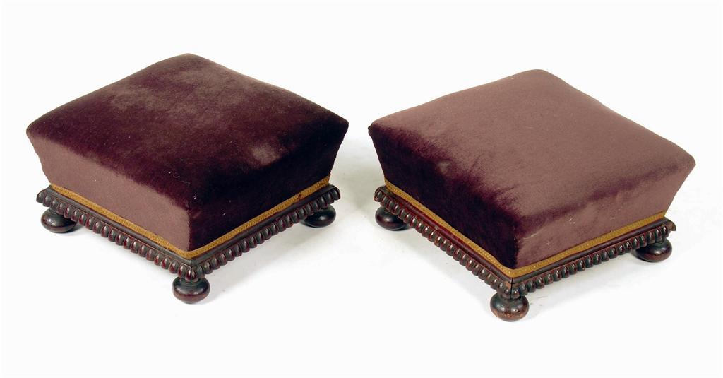 A pair of Victorian square footstools, the tapering tops with a ribbed apron on turned bun feet, 7.5in (19cm) h, 12in square. (2)