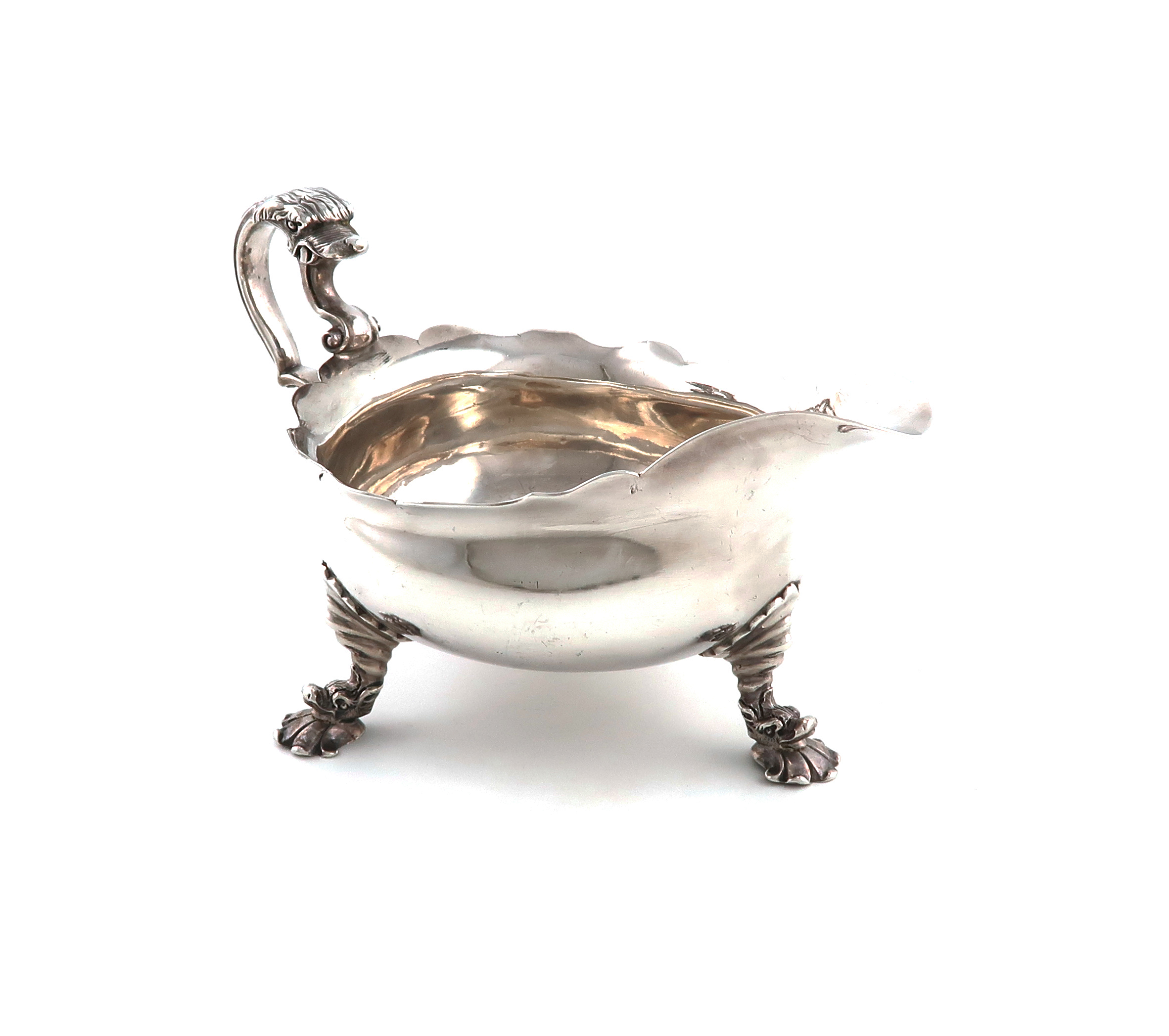 oval form, wavy-edge border, mythical beast scroll handle, on three quilted mythical beast feet on shell pads, length 20.8cm, approx. weight 13oz.