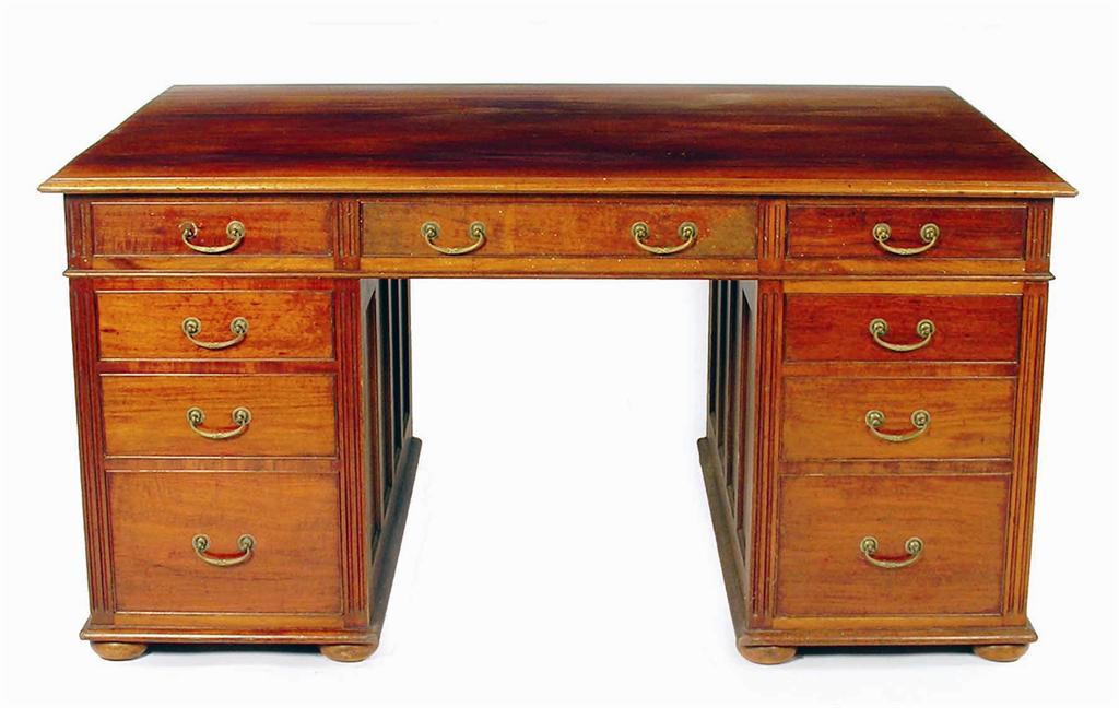 A walnut partner's pedestal desk, the moulded edge top above three frieze drawers to either side, one with an ivorene label 'A.PENGGELLEY & CO. EDWARDS TOWN, S.A.', the pedestals with three drawers, the reverse with rectangular panel doors enclosing slides, 30.25in (76.5cm) h, 60in (152.5cm) w, 42.5in (108cm) d.