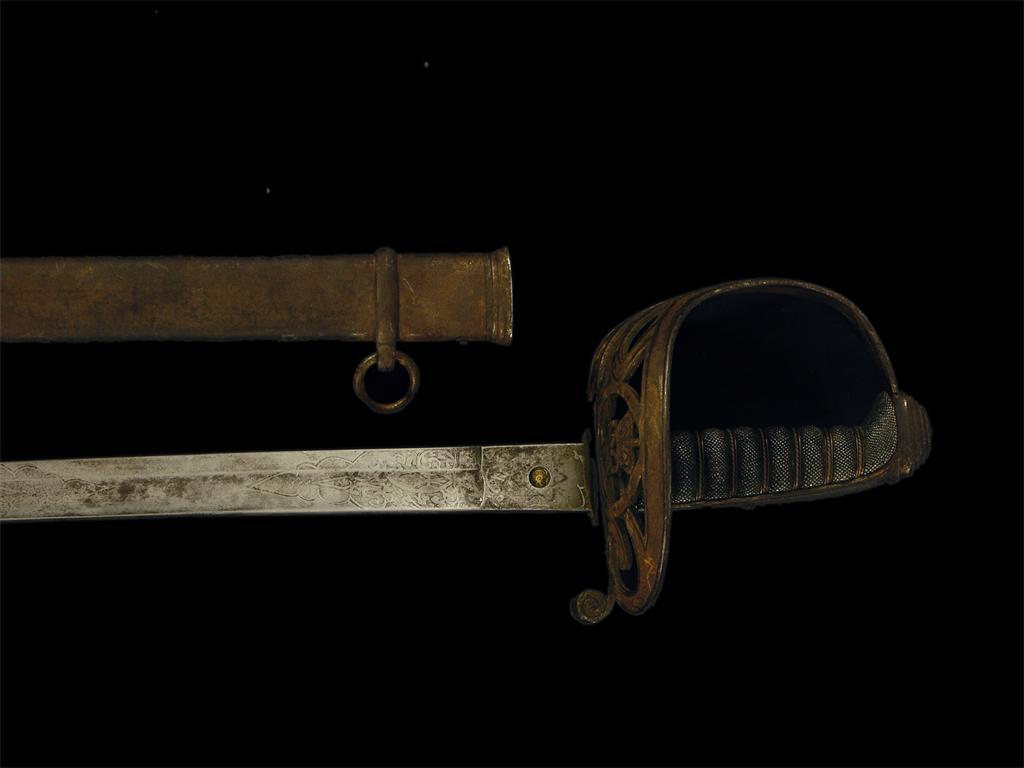 A Victorian Rifle Officer's sword, the slightly curved etched blade with a steel hilt and shark skin grip, 38.25in (97cm) l, with scabbard.