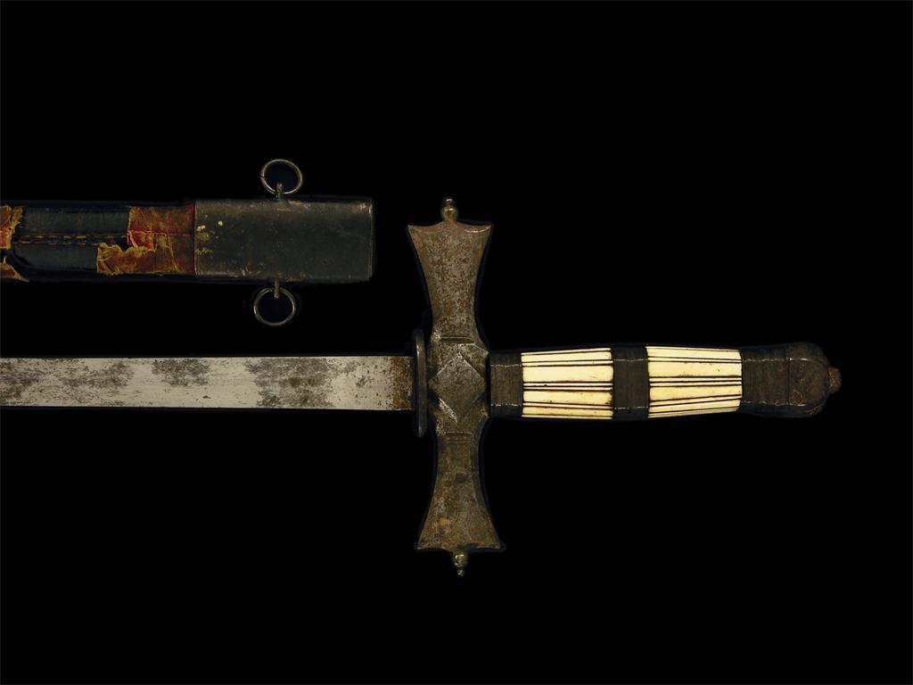 An early Victorian Society sword, the blade etched 'Kennedy, Manufacturer, Loveday St Birmm & at Mr Van's, No. 10 Little Britain, London,' with a steel mounted hilt and flared quillons to a earlier two piece steel mounted ivory grip, 36.25in (92cm) l,