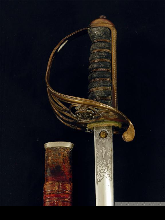 A George V dress sword, with an etched London made blade and a open brass hilt and shark skin grip, 38.5in (98cm) l.