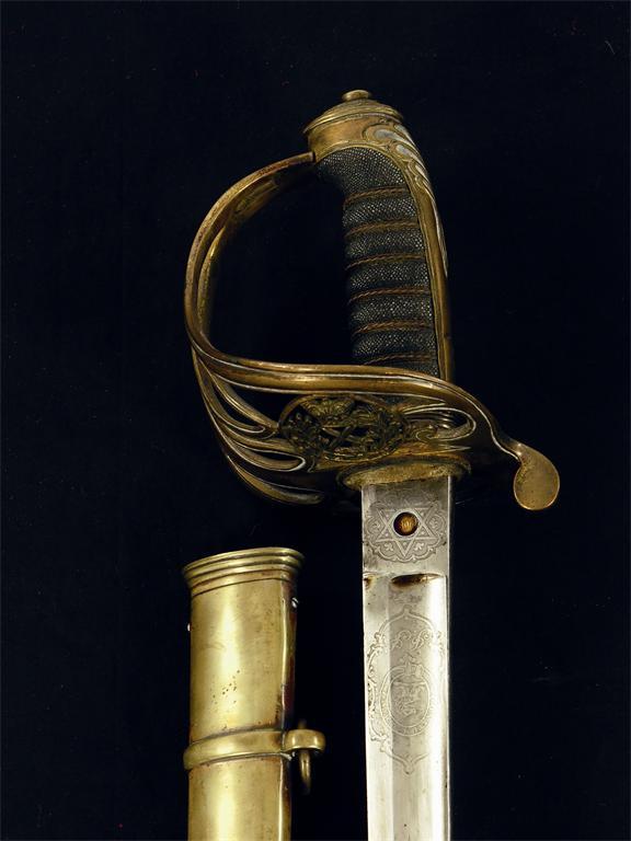 A Victorian Officer's dress sword, the etched blade Henry Wilkinson, Pall Mall, London, with gartered crest and motto 'Gonatum Erity,' the open brass hilt with regimental badge and shark skin grip, 38in (96cm) l, with brass scabbard.