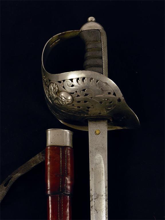 A Victorian Officer's dress sword, the etched blade inscribed 'Downie Clayton Street Newcastle on Tyne,' with a pirced and engraved guard with applied Fusilier's badge and a shark skin grip, 38in (96.5cm) l, leather covered scabbard.