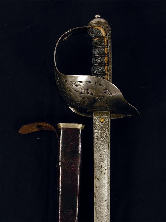 A Victorian Officer's dress sword, the etched blade by Robt. Mole & Sons, Birmingham, for The Royal engineers, with pierced guard and shark skin grip, 38.5in (98cm) l, with leather covered scabbard.