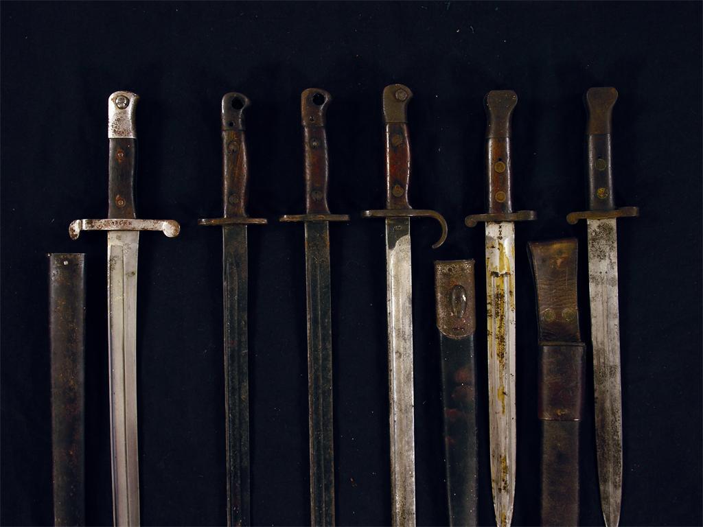 An English bayonet, stamped 'Sanderson, Sheffield, crowned V.R,' with scabbard and five others, two with scabbards. (6)