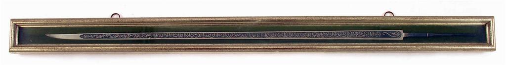 An eastern blade, 73cm long, etched Arabic script, cased.