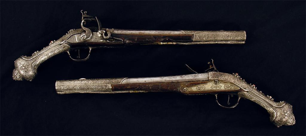A pair of Turkish flintlock pistols, with engraved steel and part faceted barrels, applied filigree to the handle and barrel, 20in (51cm) l. (2)