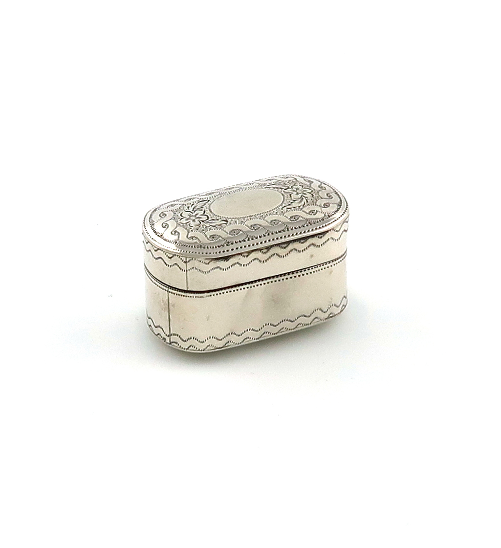 oblong form, engraved decoration, the interior with a hinged steel grater, length 4.1cm, approx. weight 0.8oz.