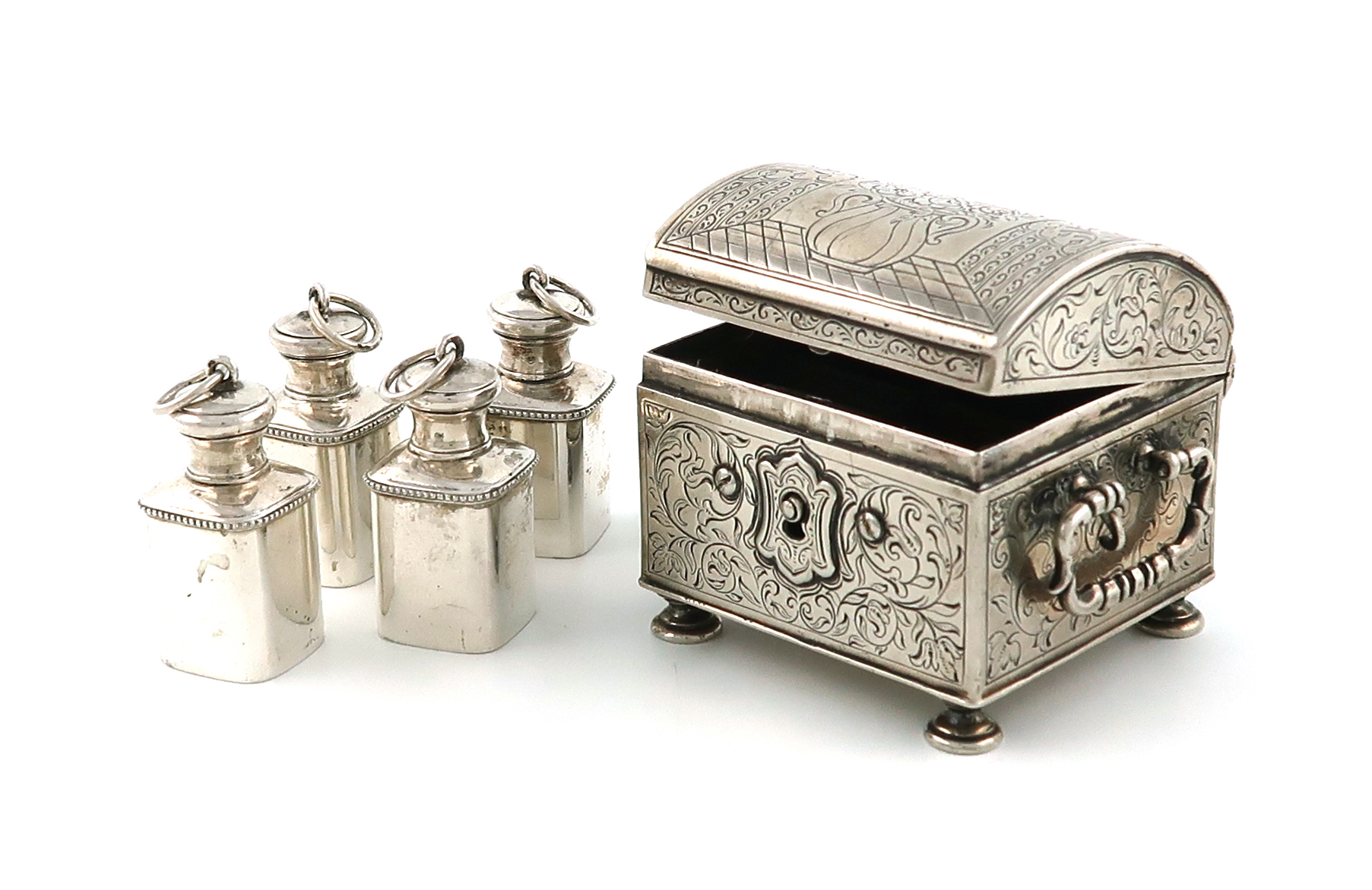 rectangular form, domed cover, engraved with a vase of flowers and foliate scroll decoration, drop-ring handles, on four bun feet, the velvet lined interior with four scent flasks, of upright rectangular form, pull-off covered with ring handles, with a lock and lacking key, the cover locks if shut, length 5.5cm, approx. weight 5oz.