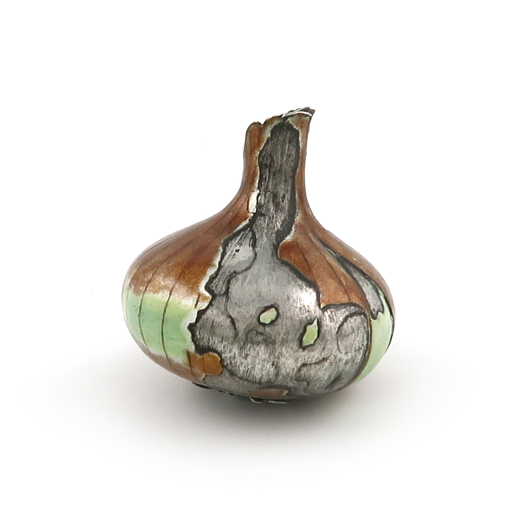 modelled as an onion, with brown and light green enamel decoration simulating the onion starting to peel, the underside with roots and a turn-action pop-up section, the hinged cover opens to reveal a glass bottle, height 5.5oz.