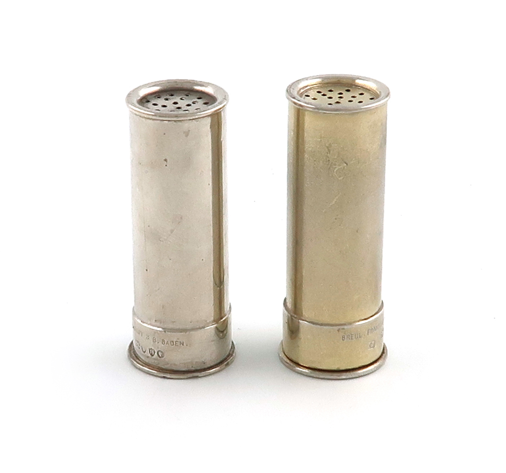 A pair of late-Victorian novelty silver and silver-gilt cartridge pepper pots,