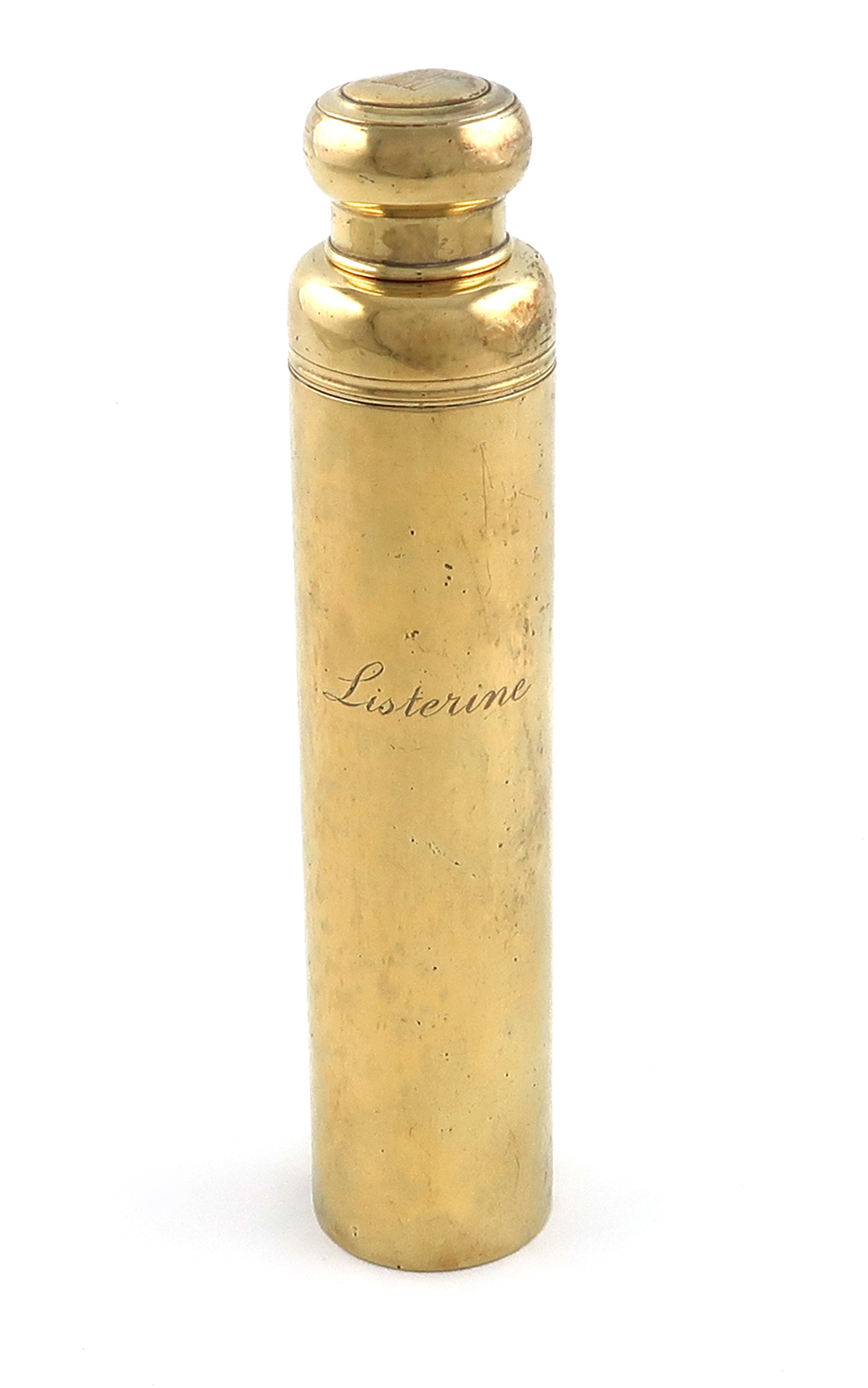 cylindrical form, inscribed 'Listerine', the screw-off cover initialled, height 17.4cm, approx. weight 5oz.