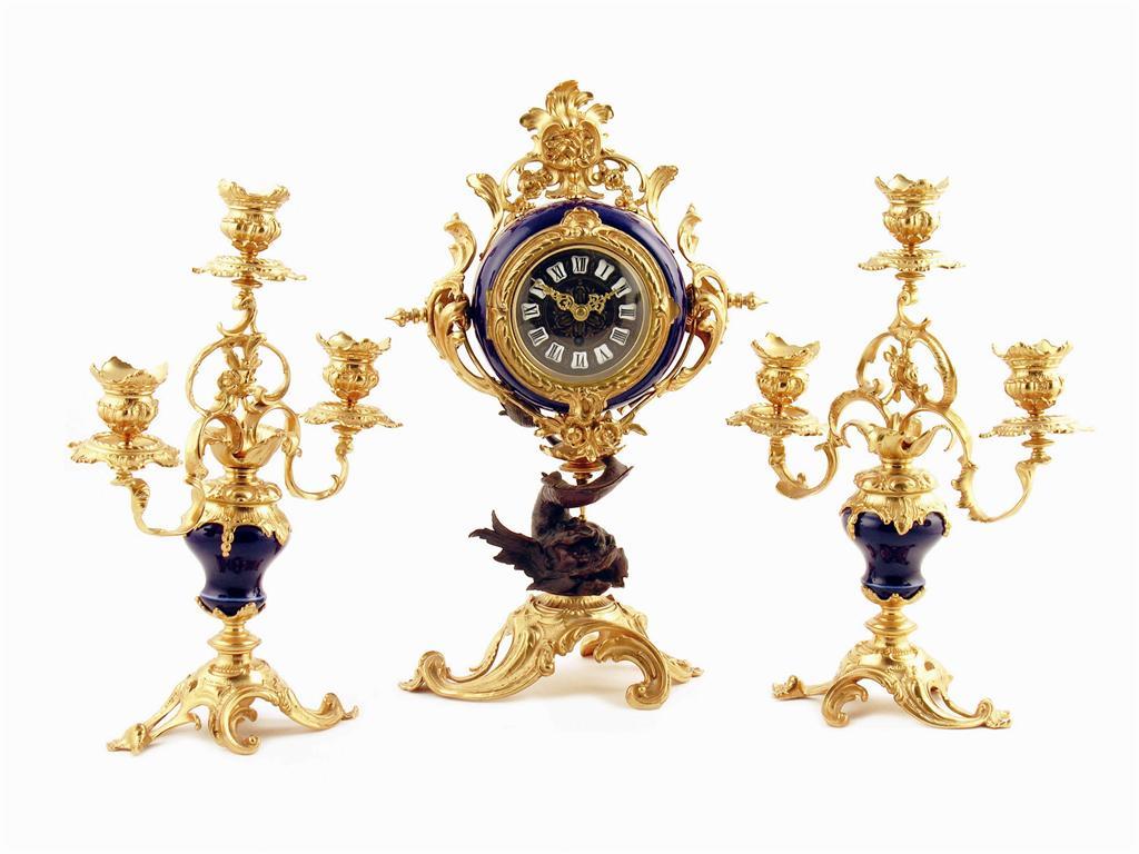 An ormolu and porcelain mounted clock garniture