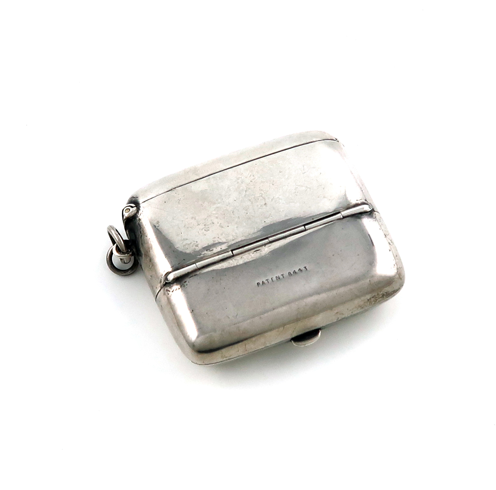 plain rectangular form, hinged cover, the side with a hinged compartment which holds a cigarette holder, with a loop attachment, length 5.5cm, approx. weight 1.7oz.