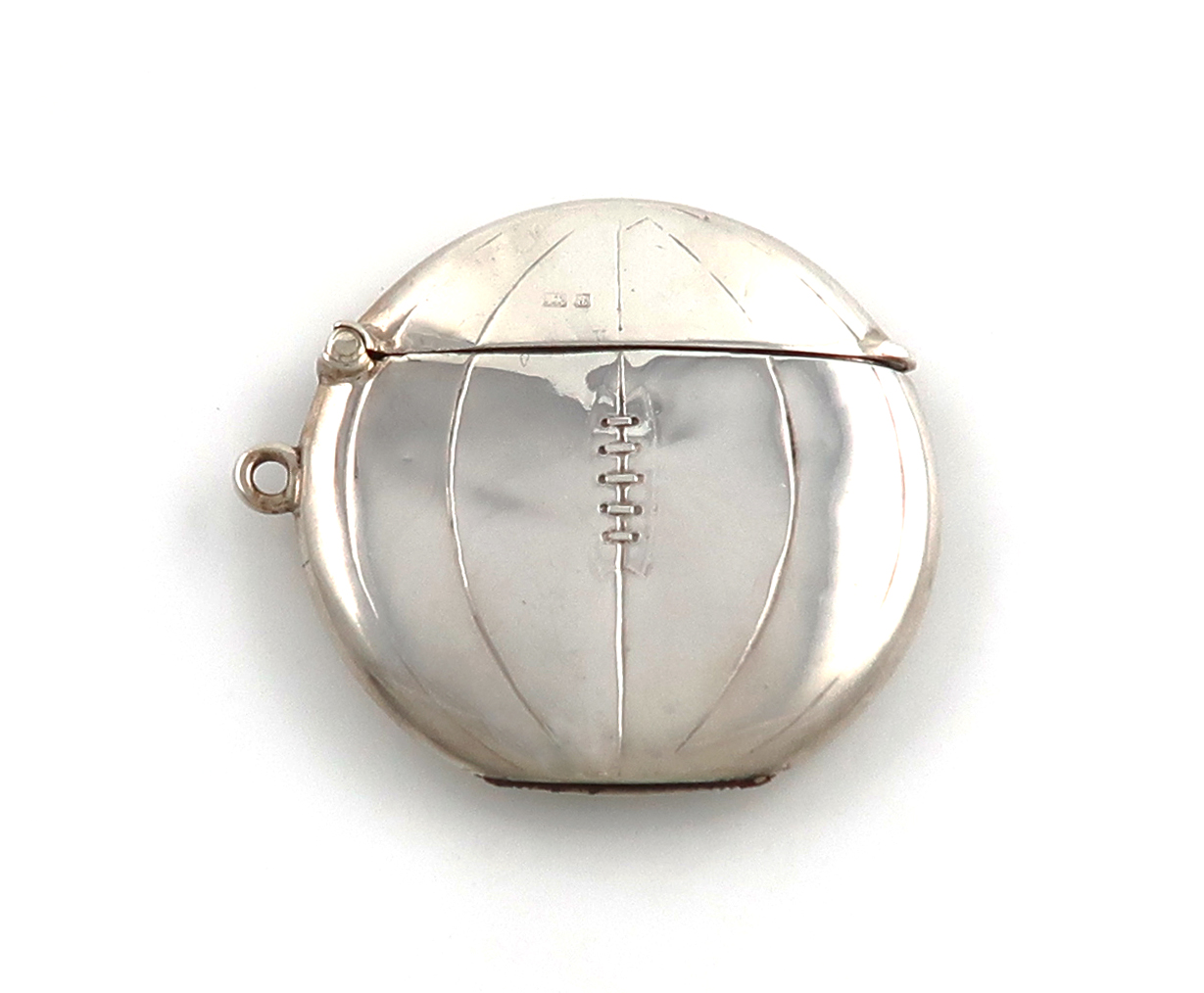 modelled as a football, hinged cover, with a ring attachment, engraved with a monogram, length 4.9cm, approx. weight 0.5oz.