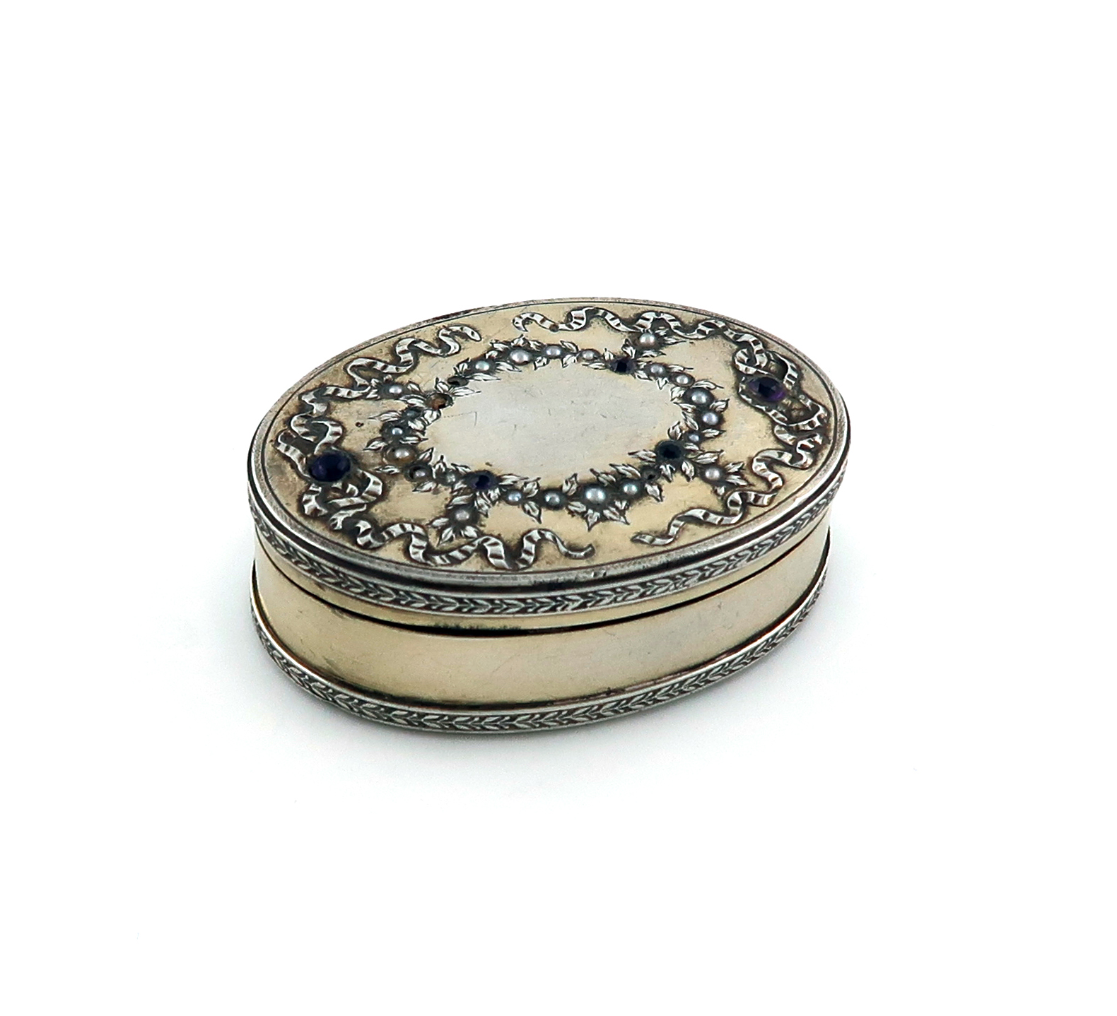 oval form, the hinged cover with foliate decoration, seed pearls and purple stones, gilded interior, length 6cm, approx. weight 1.8oz.