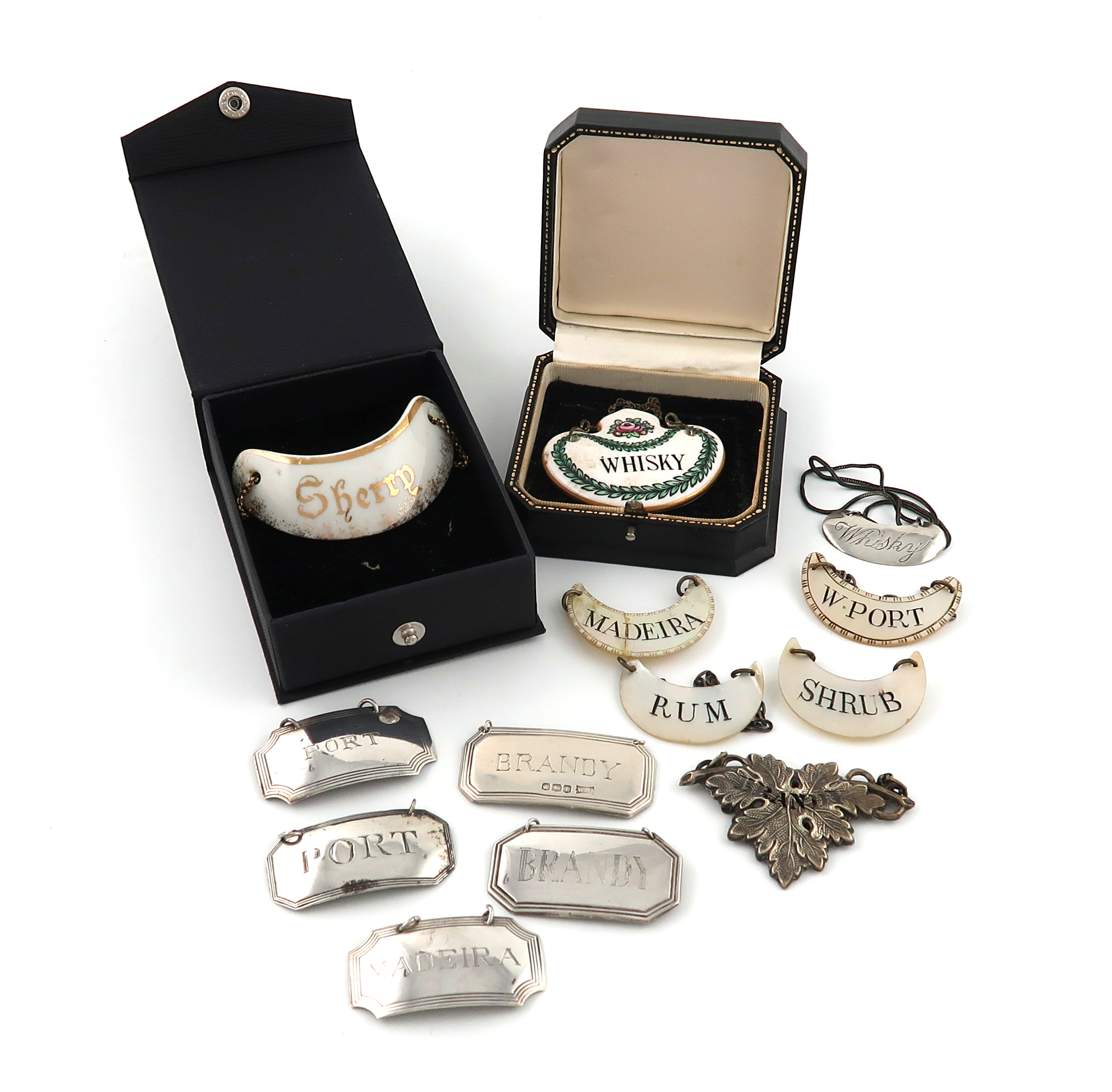 comprising silver examples: one engraved 'Port', by Susanah Barker, plus five modern ones and an electroplate label, four mother-of-pearl labels of crescent form, 'Shrub', 'Madeira', 'W.Port' and 'Rum', and two ceramic labels. (13)