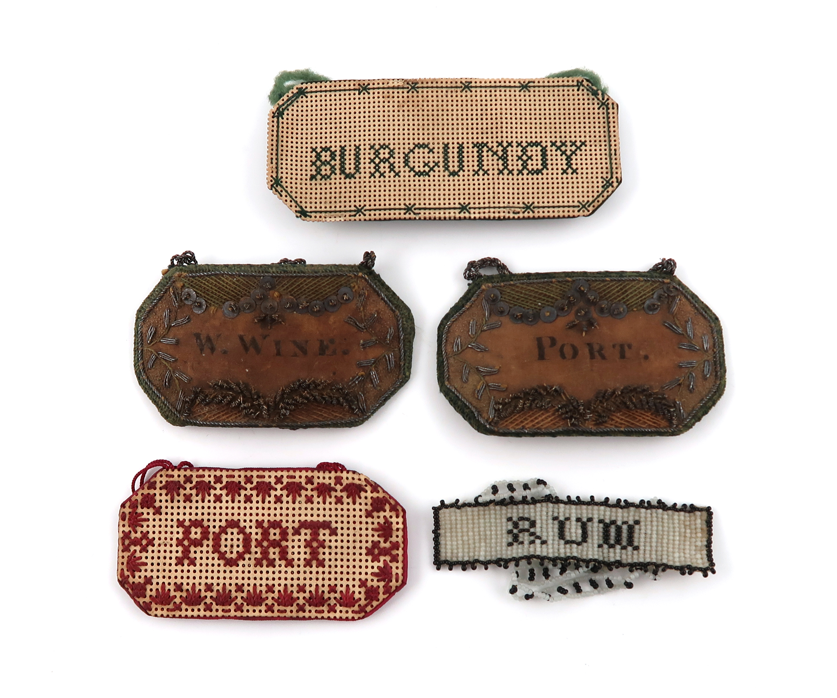 with silver wire-work decoration, titled 'W.Wine' and 'Port', length 6cm, plus a bead-work label 'Rum' and two embroidered labels 'Port' and 'Burgundy'. (5)
