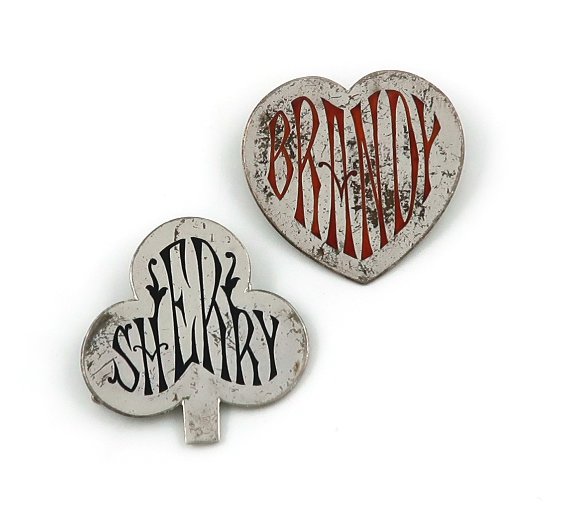 modelled as the playing card spade and heart, with black and red enamel, titled 'Brandy' and 'Sherry', length 4cm, approx. weight 0.7oz..