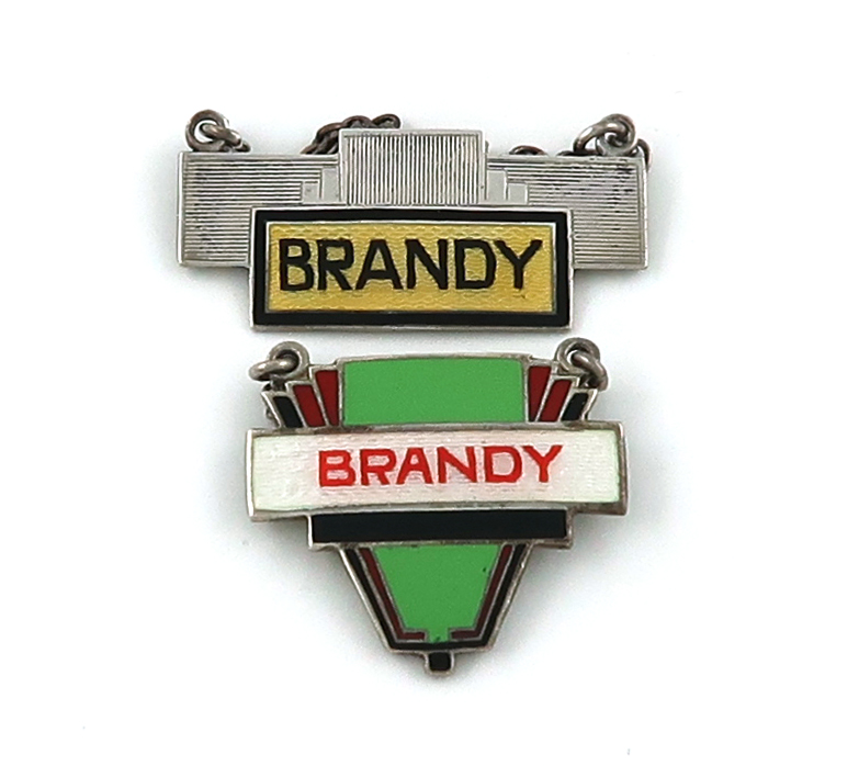 geometric form, with black, red green and white enamel, titled 'Brandy' length 3.2cm, plus another Art Deco silver and enamel wine label, by Turner and Simpson, Birmingham 1933, with black and yellow enamel, titled 'Brandy', length 4.7cm, approx. weight 1oz. (2)