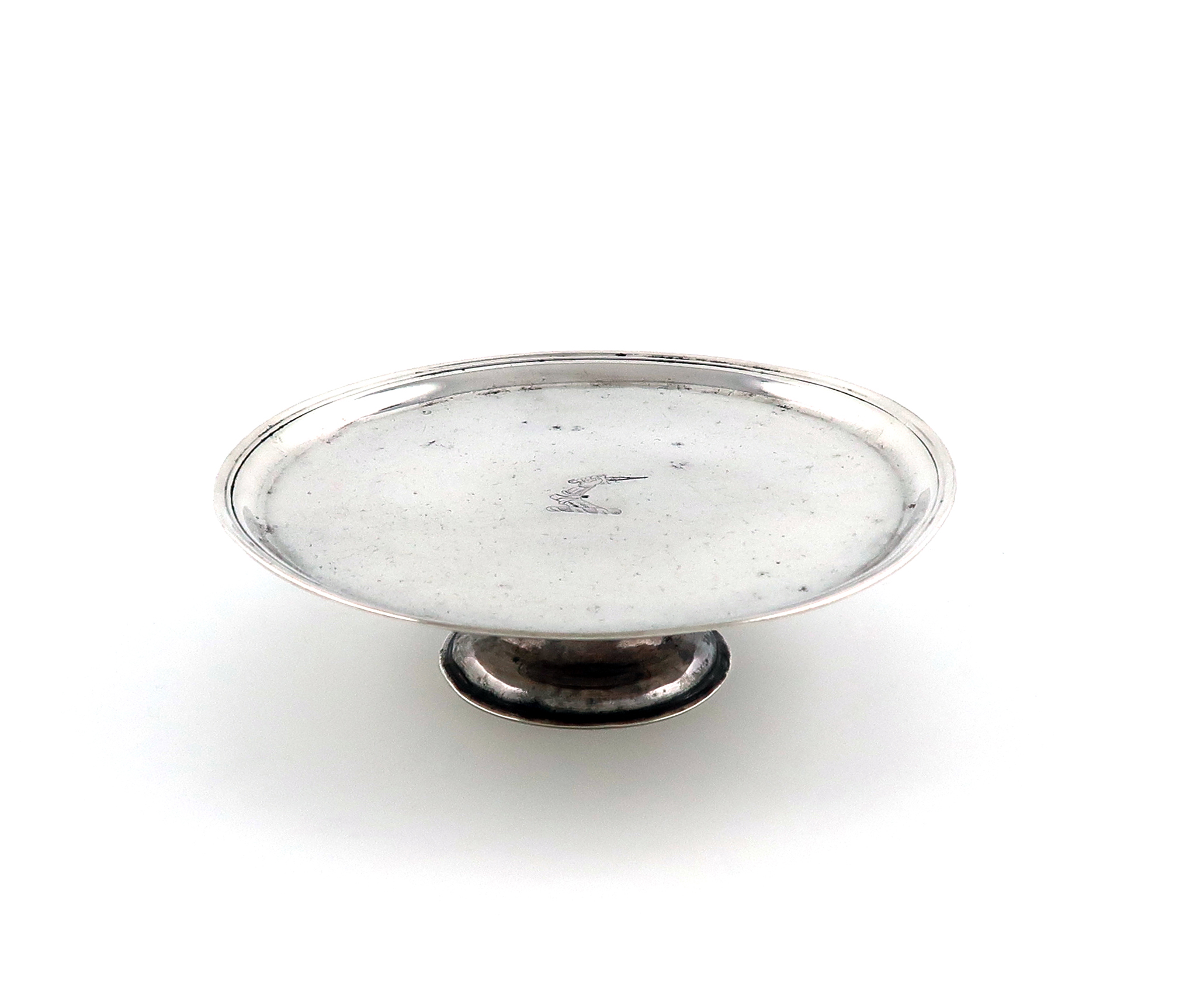 circular form, moulded border, engraved with a later crest, on a raised circular foot, diameter 13.8cm, approx. weight 5oz.