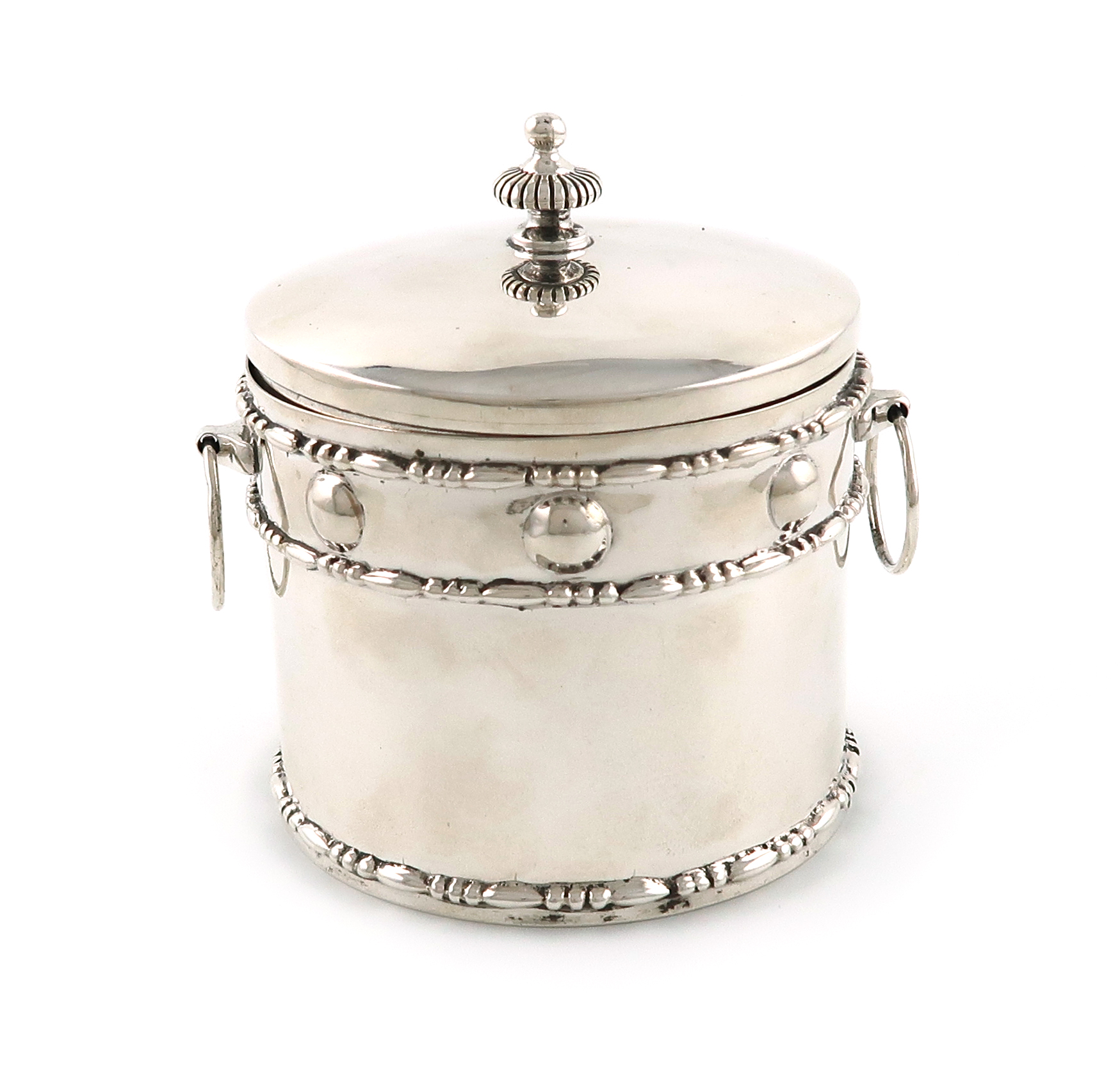 cylindrical form, punch bead girdle, egg and bead border, drop ring handles, the hinged cover with a fluted finial, height 10.5cm, approx. weight 7.7oz.