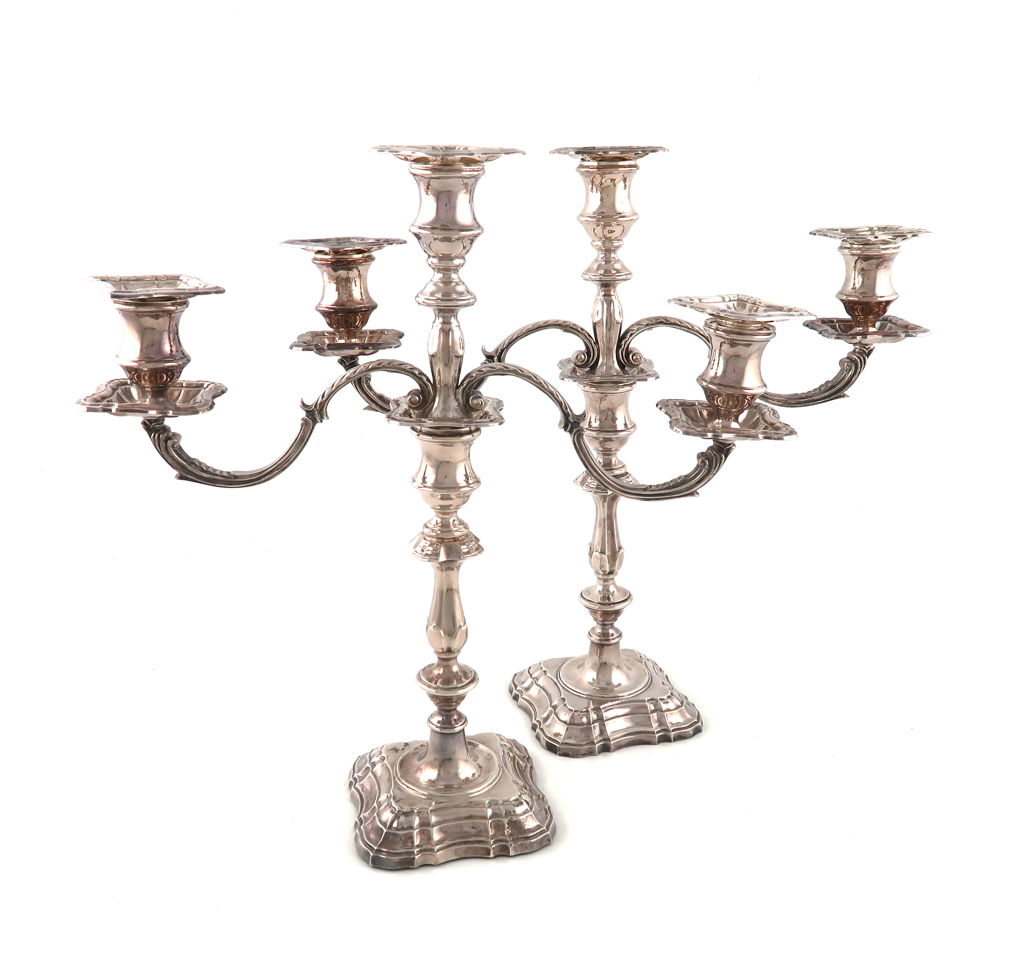 knopped baluster columns, spool-shaped capitals, with two scroll arms each supporting a capital and with a central light, detachable drip pans, on raised shaped square bases, height 36.5cm, approx. weight of branches 53oz. (2)