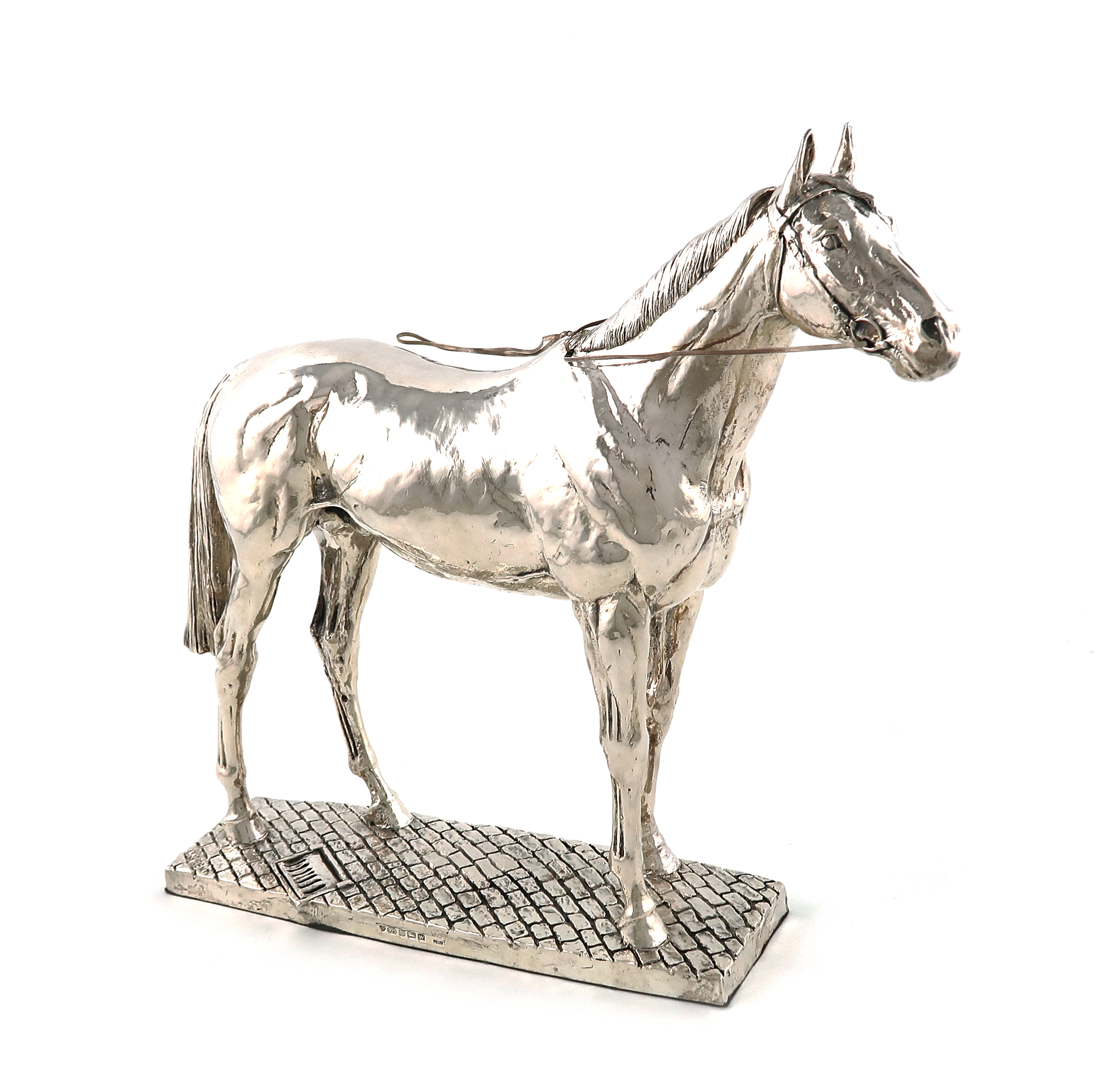 modelled in a standing position, with reins, on a rectangular base with cobbled decoration, height 27cm.