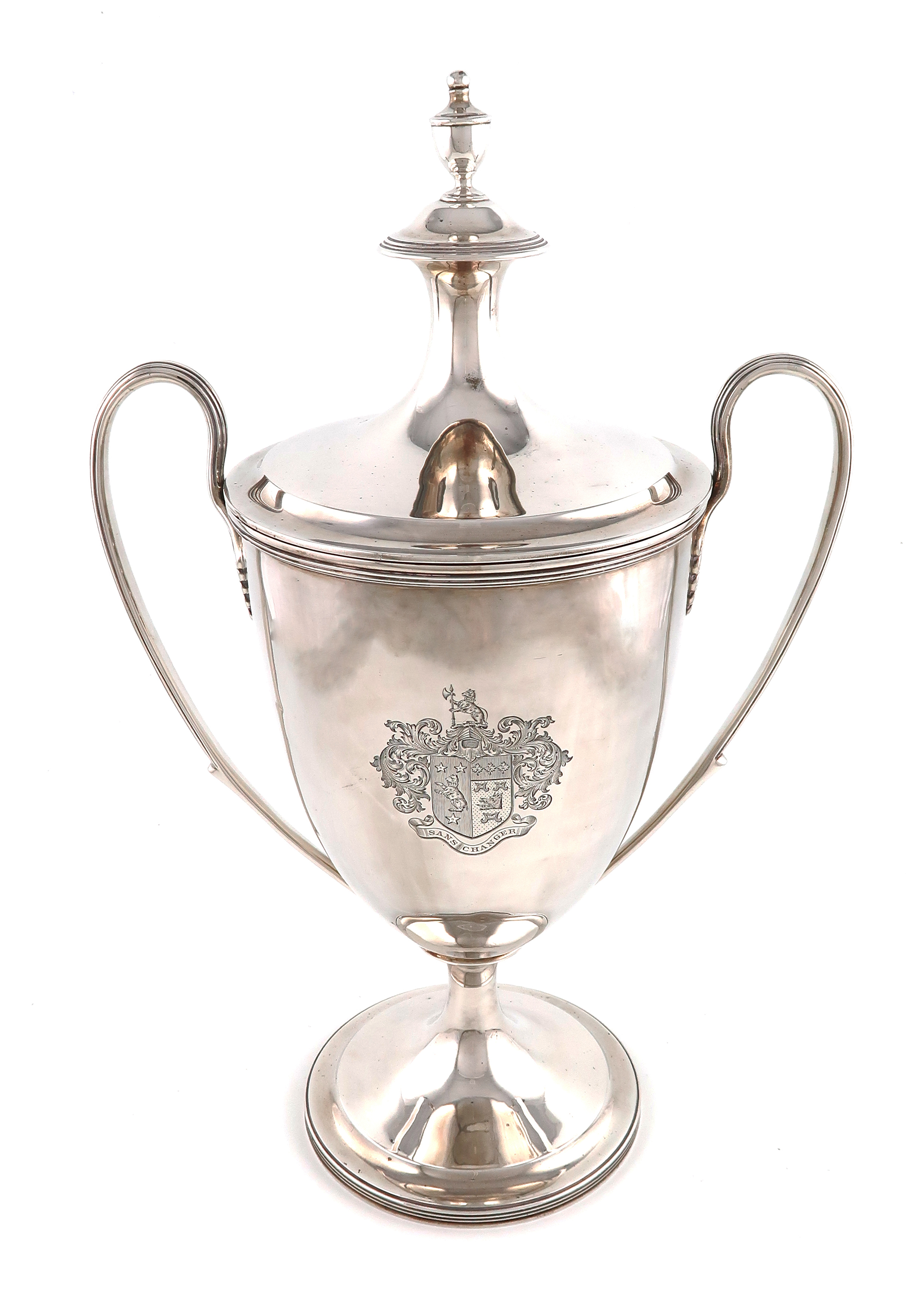 plain urn form, shell-capped scroll handles, the front engraved with an armorial, pull-off cover with an urn finial, on a raised circular foot, the underside inscribed 'This cup represents the value of gold lace taken off Hussar and Equery uniforms worn by Major General Sir Stanley Clarke', height 45cm, approx. weight 67oz.