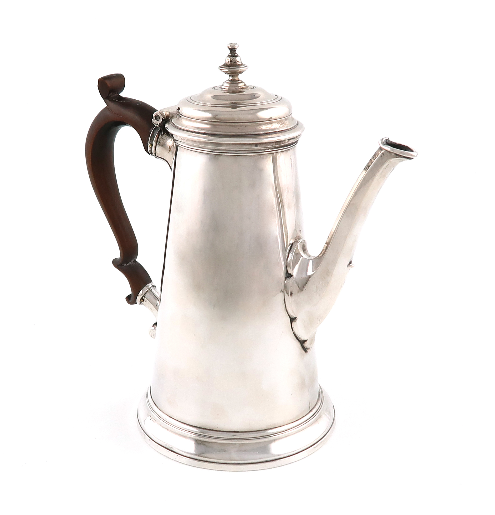 tapering circular form, wooden scroll handle, the hinged cover with a knop finial, faceted tapering spout, on a circular foot, the base scratch initialled 'E.G', height 21.5cm, approx. weight 23.7oz.