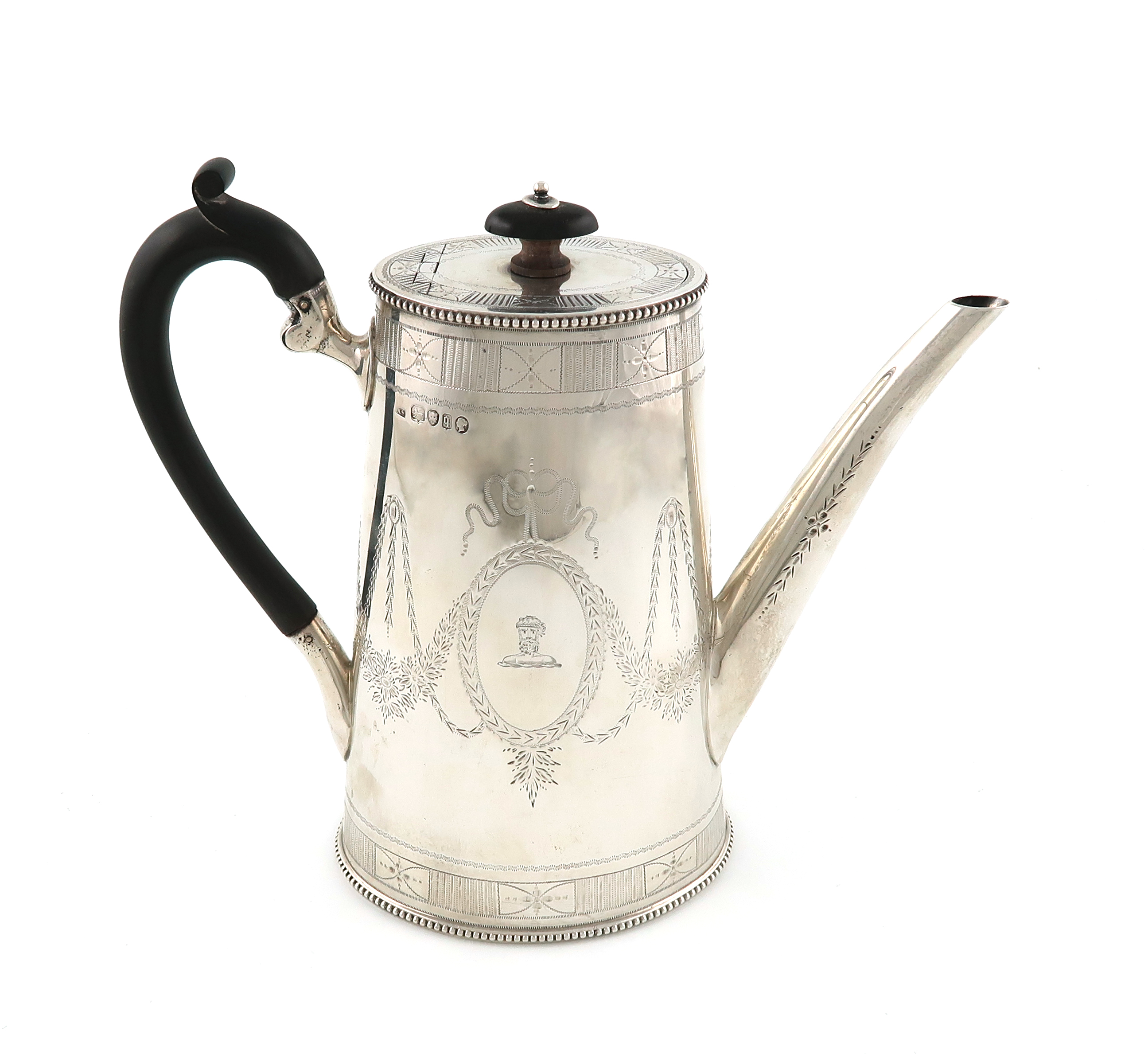 tapering oval form, engraved decoration, tapering spout, scroll handle, flush=hinged cover, with an oval finial, engraved with a crest, height 21.7cm, approx. weight 18.6oz.