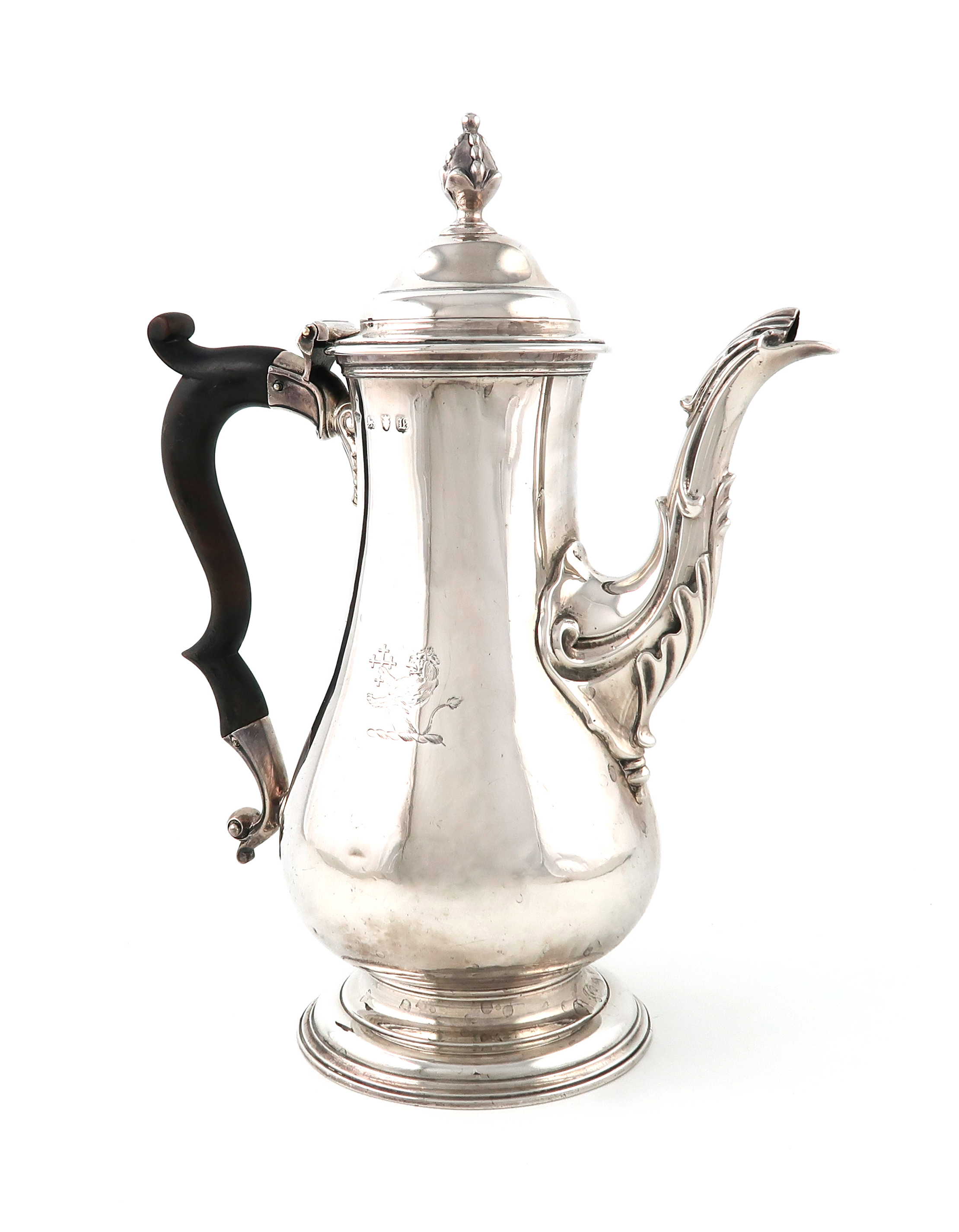 baluster form, scroll handle, domed hinged cover with a baluster finial, leaf capped spout, on a circular foot, engraved with a crest, height 28.5cm, approx. weight 28.4oz.