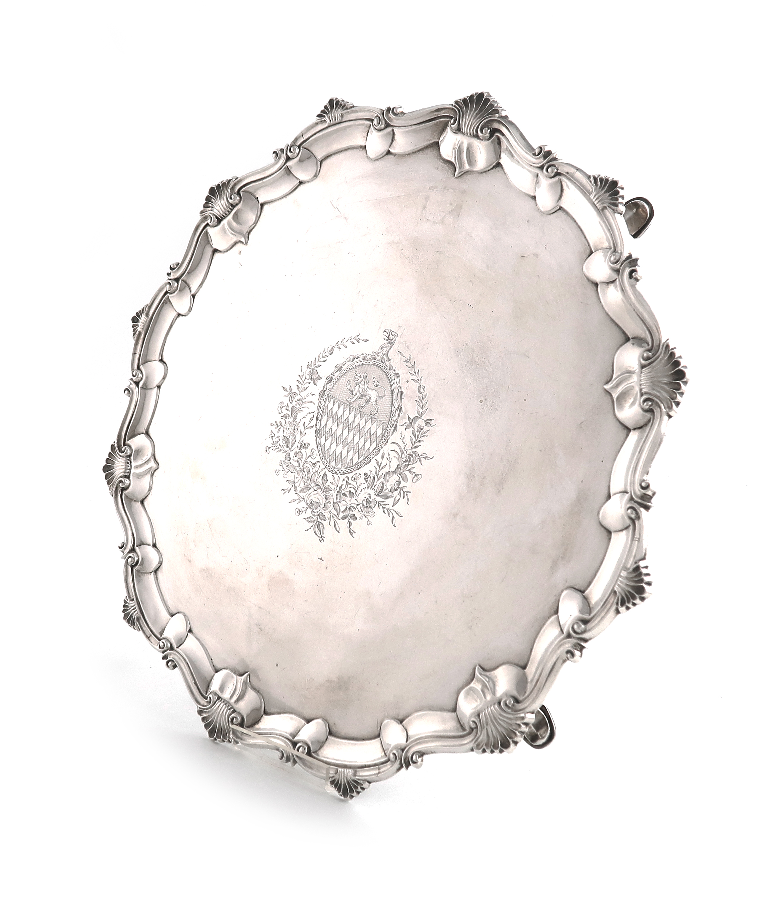 circular form, shell and scroll border, the centre with an armorial within foliate mantling, on four hoof feet, diameter 36.5cm, approx. weight 41oz.