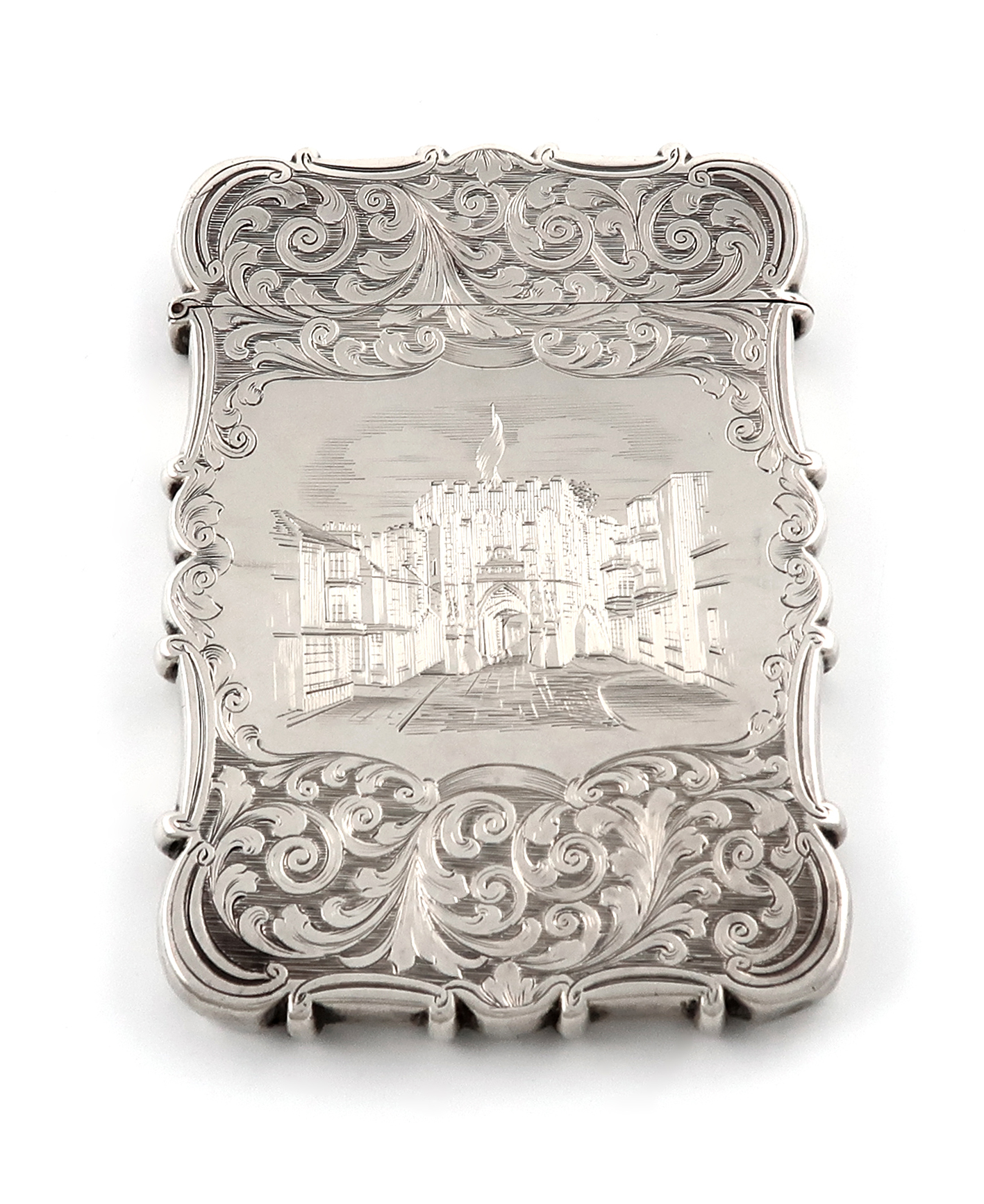 A Victorian silver engraved 'castle-top' card case, Southampton Bargate,