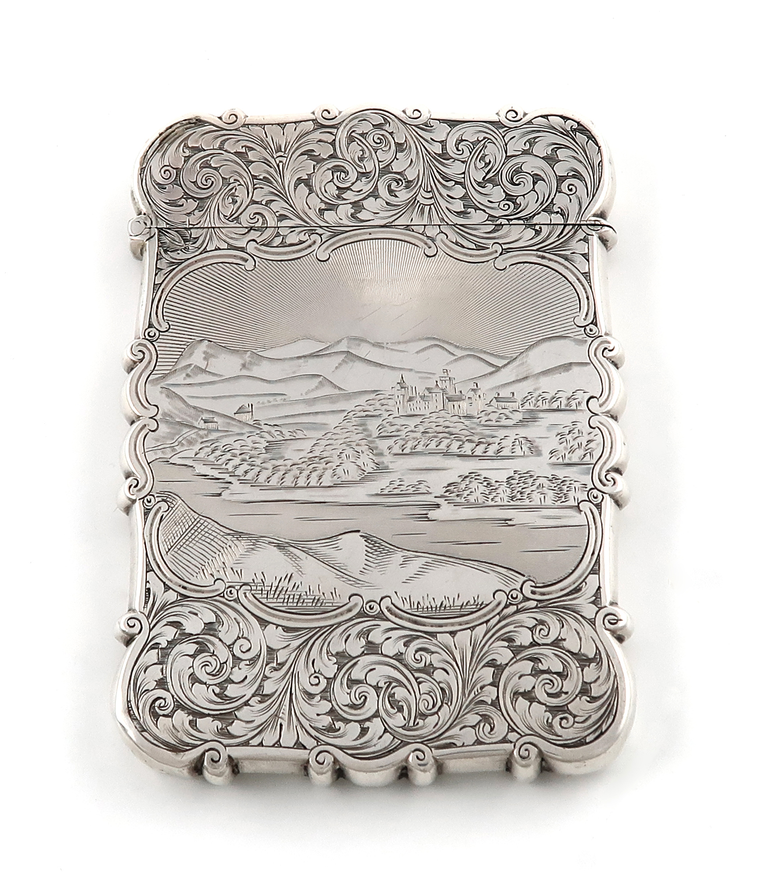 A Victorian silver engraved 'castle-top' card case, Balmoral Castle,