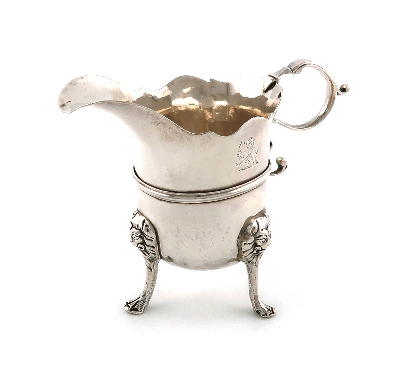 helmet form, scroll handle, central girdle, on three lion mask scroll legs, engraved with a crest, height 10.5cm, approx. weight 4.9oz.